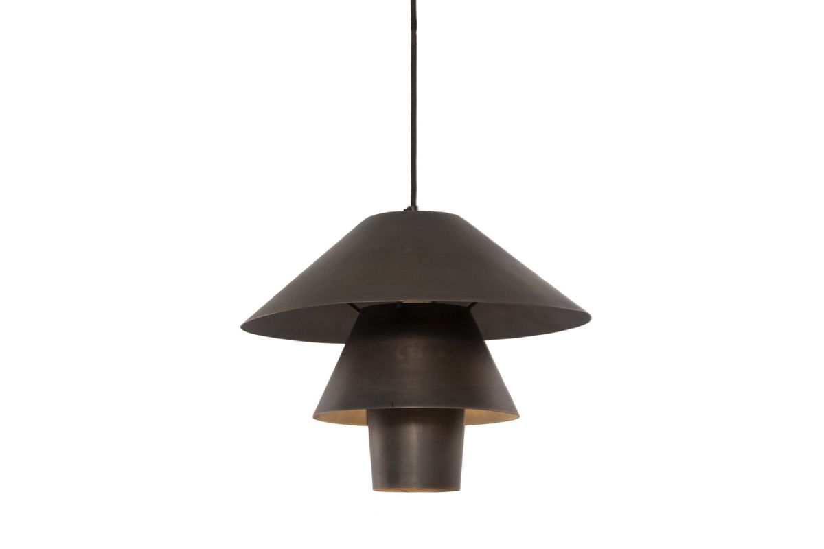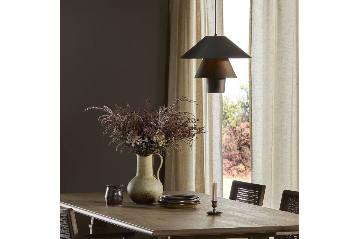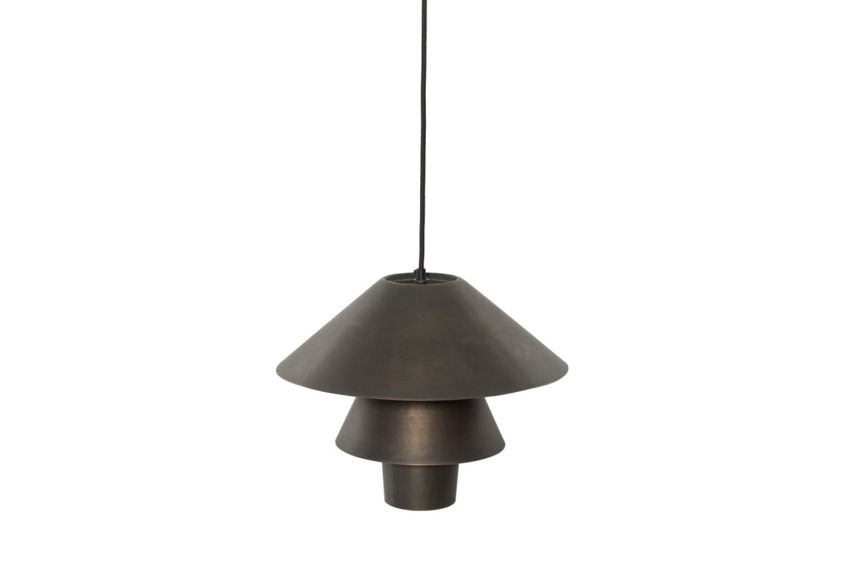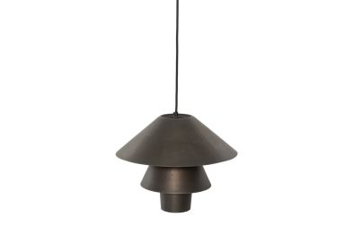 Inspired by vintage Art Deco and Danish design, a unique pendant makes a unique statement with its tiered silhouette. Finished in dusty iron with bronzed copper undertones, for s a subtle metallic sheen. With slighter scaling, perfect for hanging in multiples.