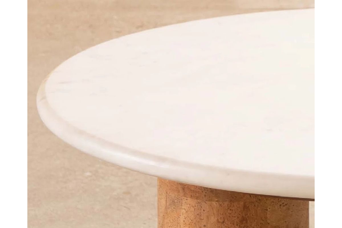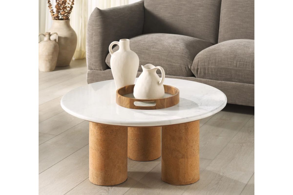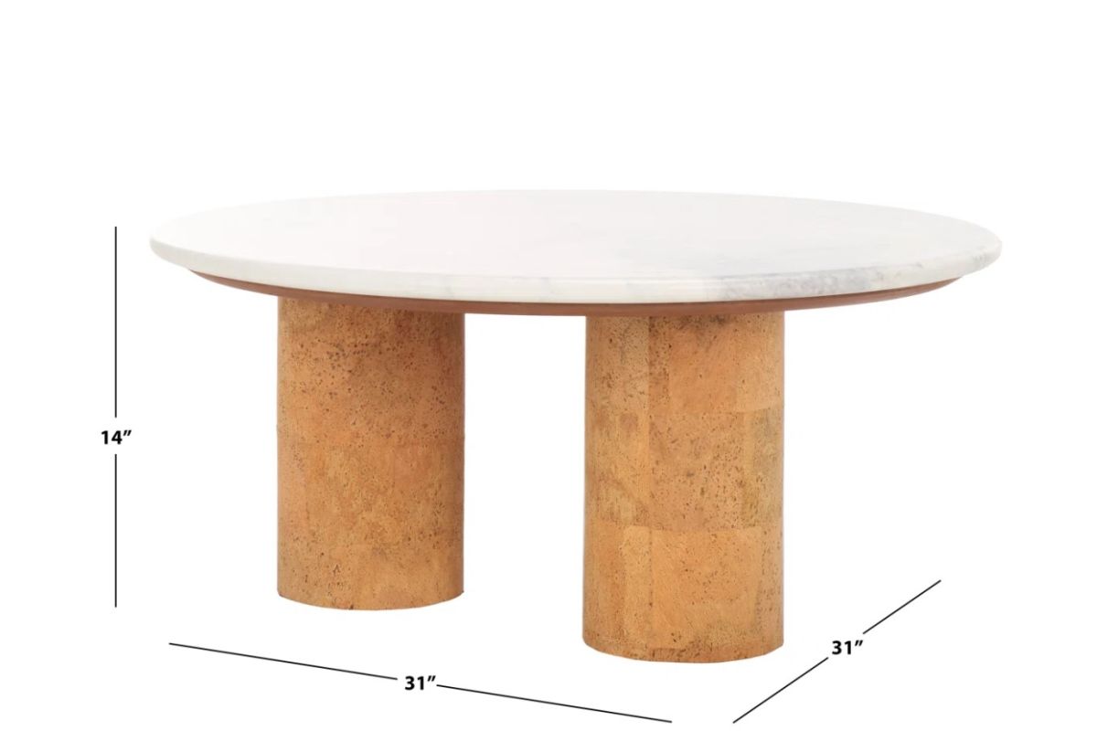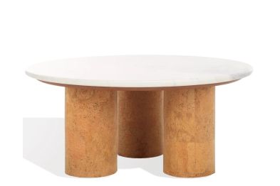 Embrace artistic expression with a style that highlights bold designs with sleek lines, neutral elements, and a minimalist aesthetic This brown living room coffee table is crafted from high-quality wood and topped with beige travertine stone Round living room furniture features an oiled brown finish with a beige marble top that adds a touch of elegance The wood coffee table includes a sturdy base and smooth stone surface for added sophistication The brown wood coffee table measures 31.50L x 31.50W x 16H inches, and weighs 71.20 lbs