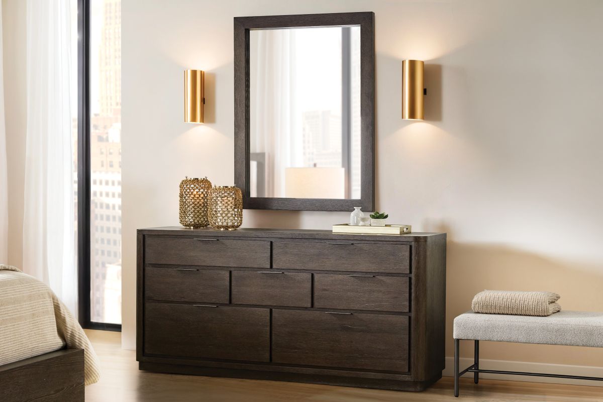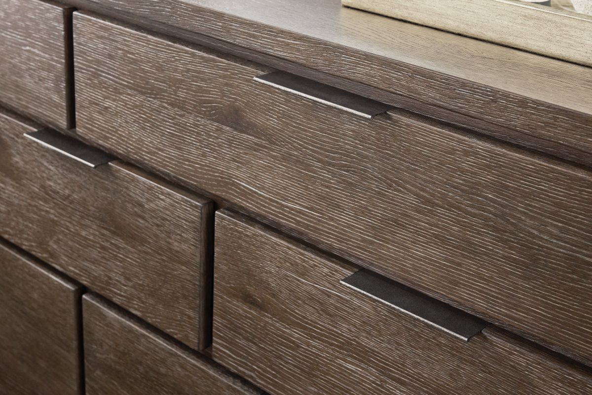 Recessed detailing defines seven drawers on the Outline dresser. Three drawer sizes create a geometric visual style, while natural wood grain and metal pulls balance an organic look. The design, resting on a plinth base, is finished in Cassel.