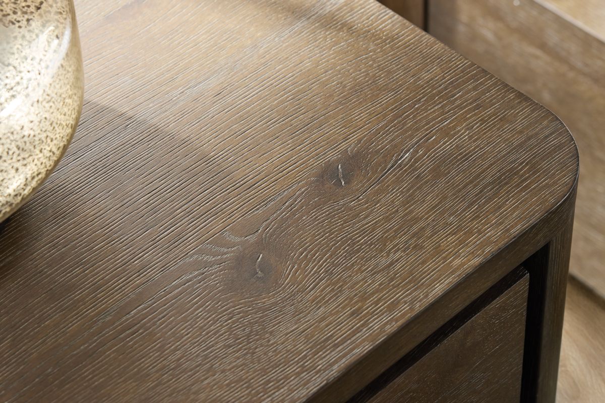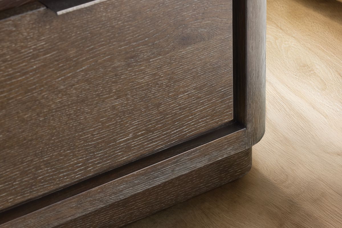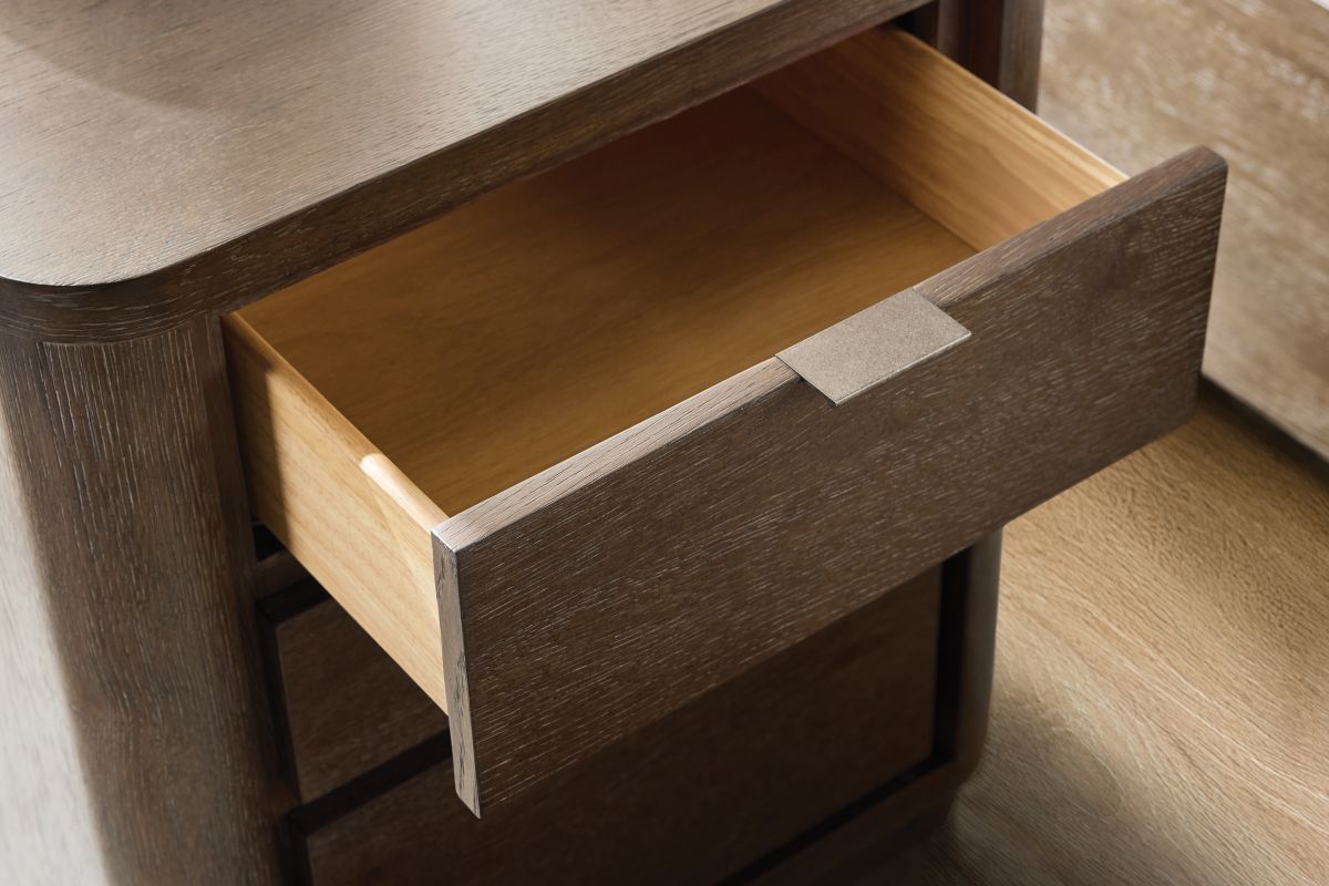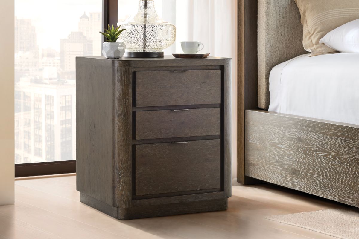 Recessed detailing defines the three drawers on the Outline nightstand. Varying drawer sizes create a geometric visual style, while natural wood grain and metal pulls balance an organic look. The design, resting on a plinth base, is finished in Cassel.