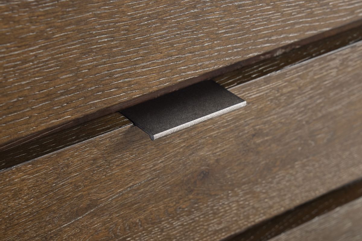 - Three pull-to-open, soft-close drawers with applied textured aluminum tab pulls in Atra finish