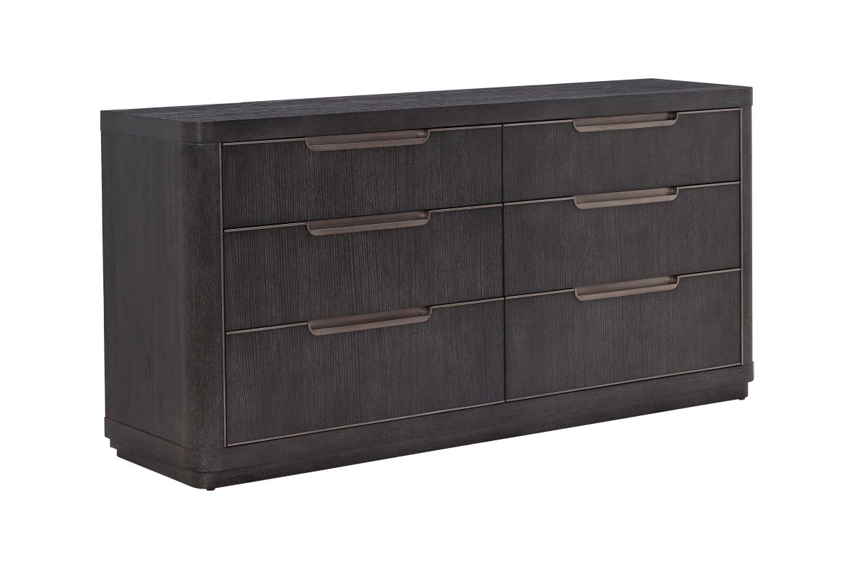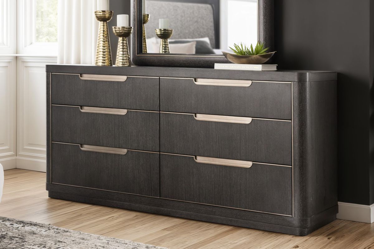 Elevate your bedroom with the refined elegance of this Preston Heights 6-drawer dresser where modern design meets timeless detail. Crafted with softened edges for a smooth, inviting silhouette, this piece features subtly bronzed tone hardware and raised metal trim that adds just the right touch of contemporary sophistication.