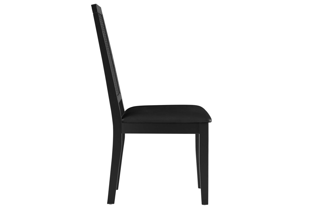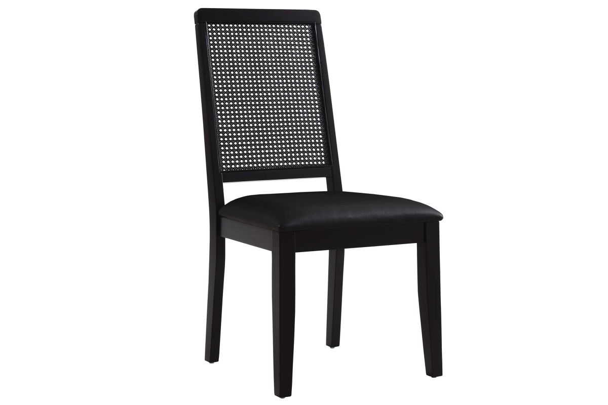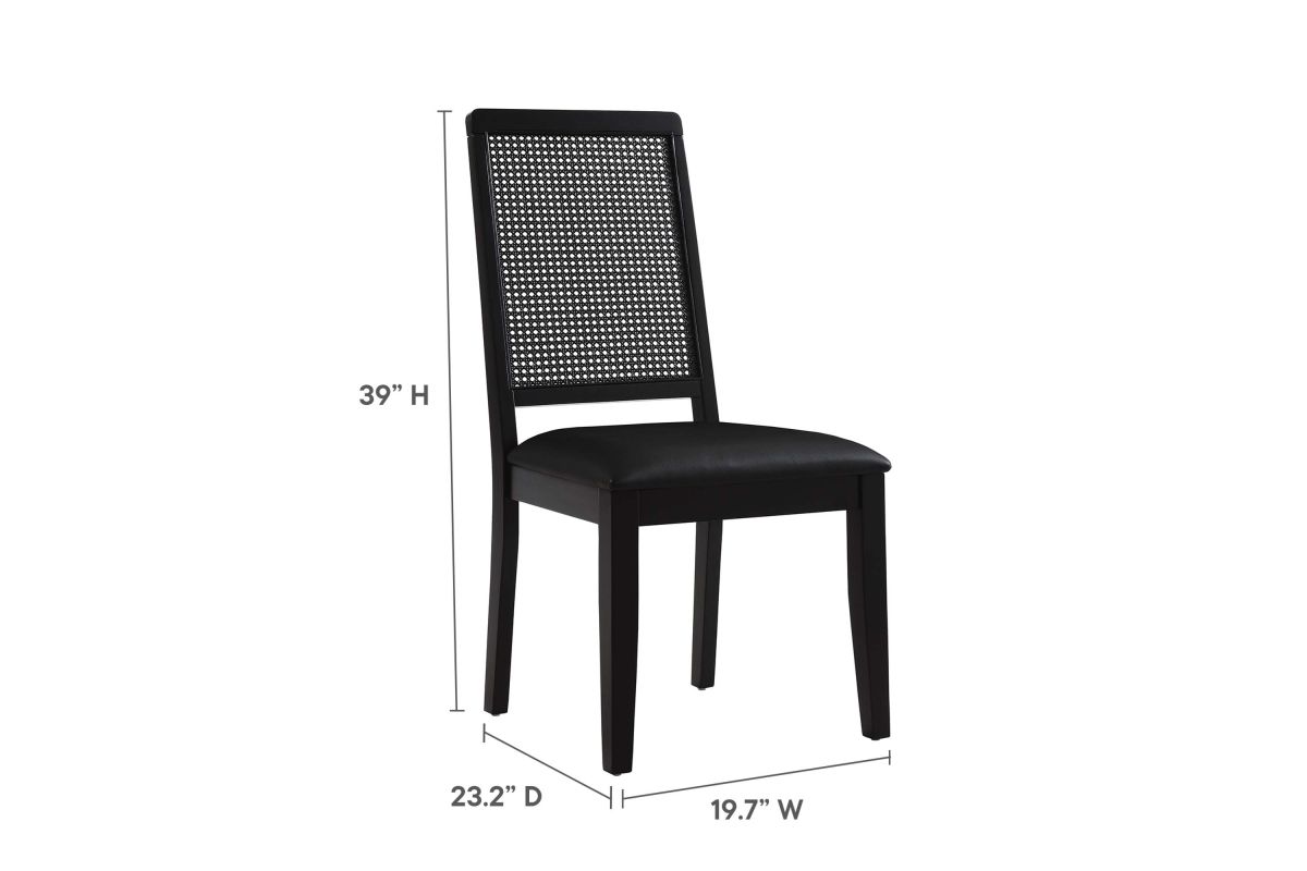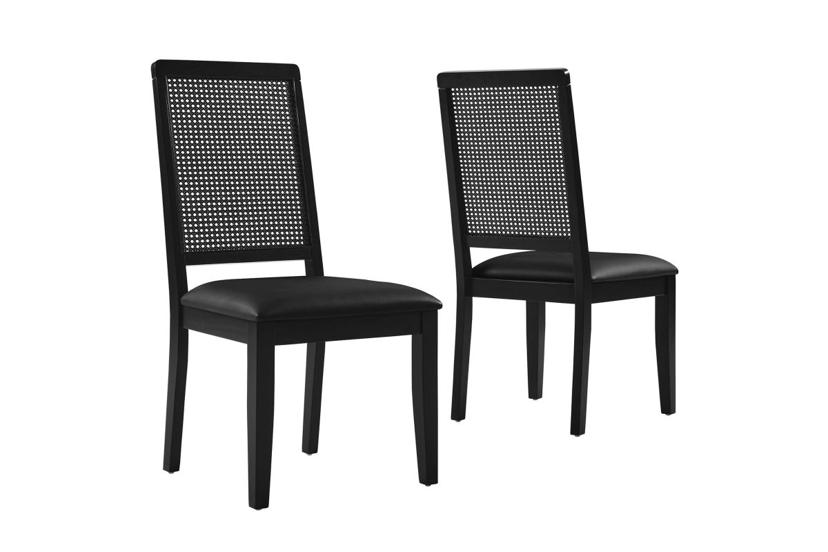 Discover the Arlo Dining Chair Set of Two, a stylish union of durability and design. These wood dining chairs boast expertly crafted faux rattan cane backrests, providing a breezy complement to the solid wood frames. Comfort is key with seats that feature dense foam padding enveloped in supple vegan leather. This set of 2 dining chairs includes non-marking foot glides protect floors from scuffs and scratches. The Arlo chairs seamlessly merge the rustic allure of farmhouse chairs with the sleekness of modern dining room furniture, making them ideal for use as both dining and accent chairs. Assembly required. Weight Capacity: 551 lbs.