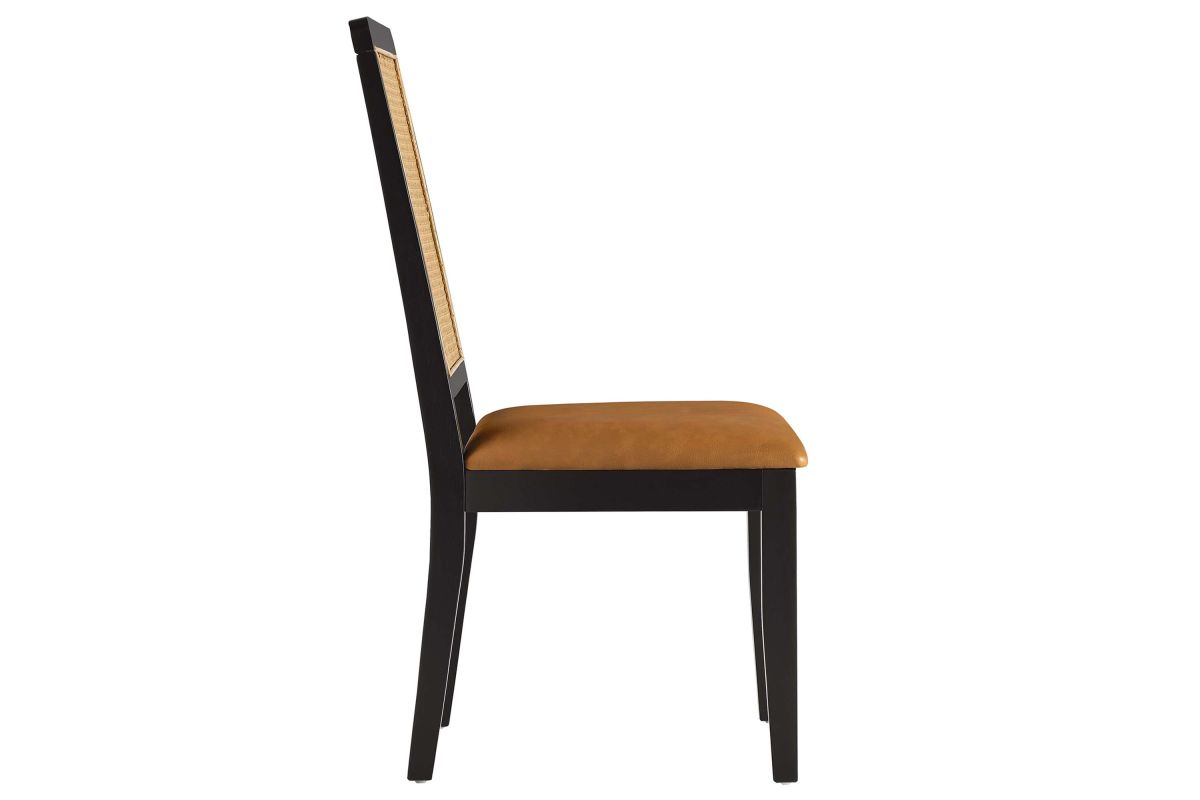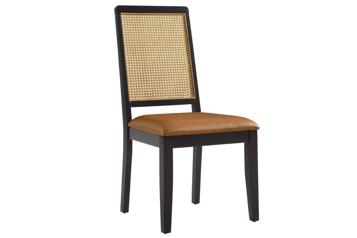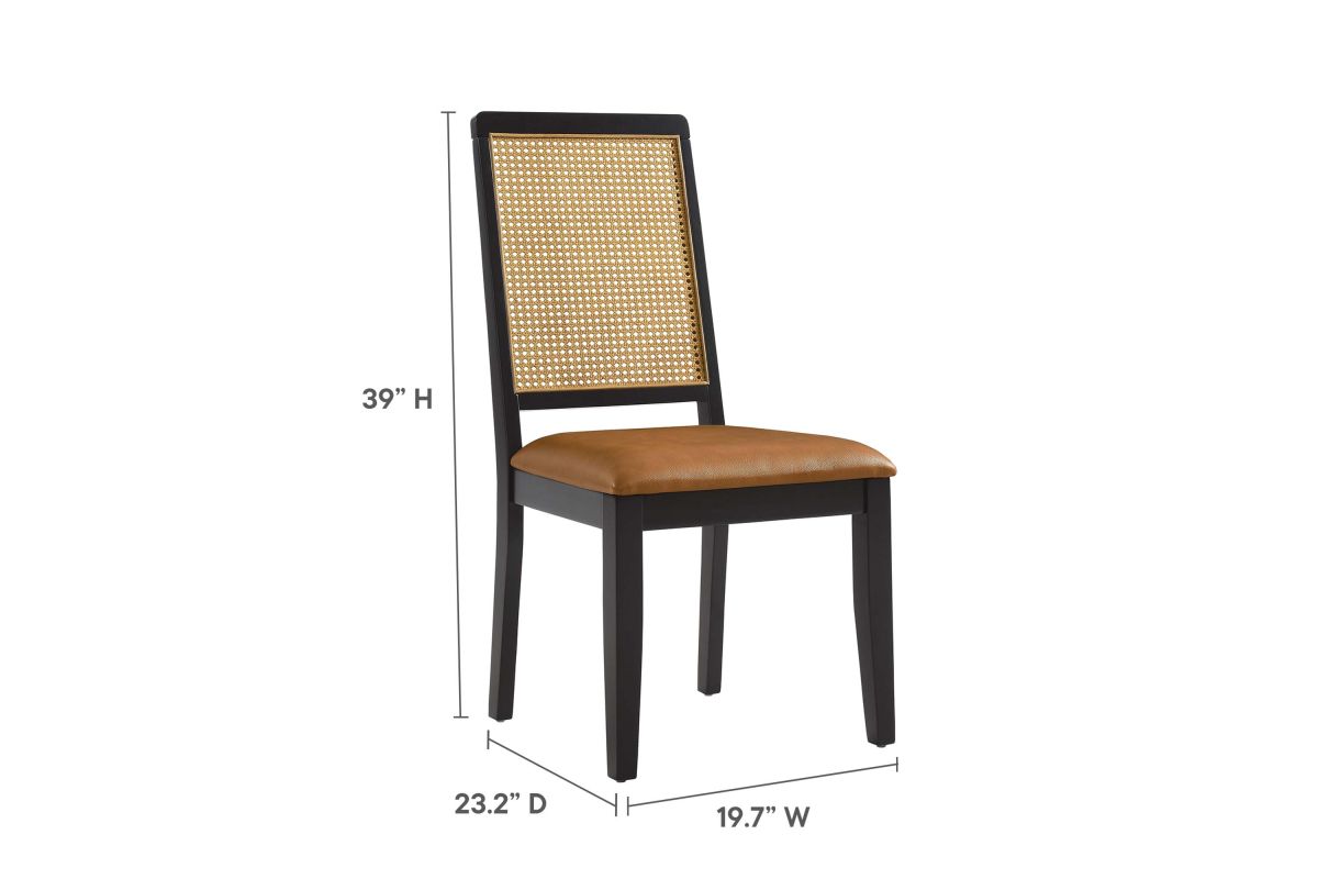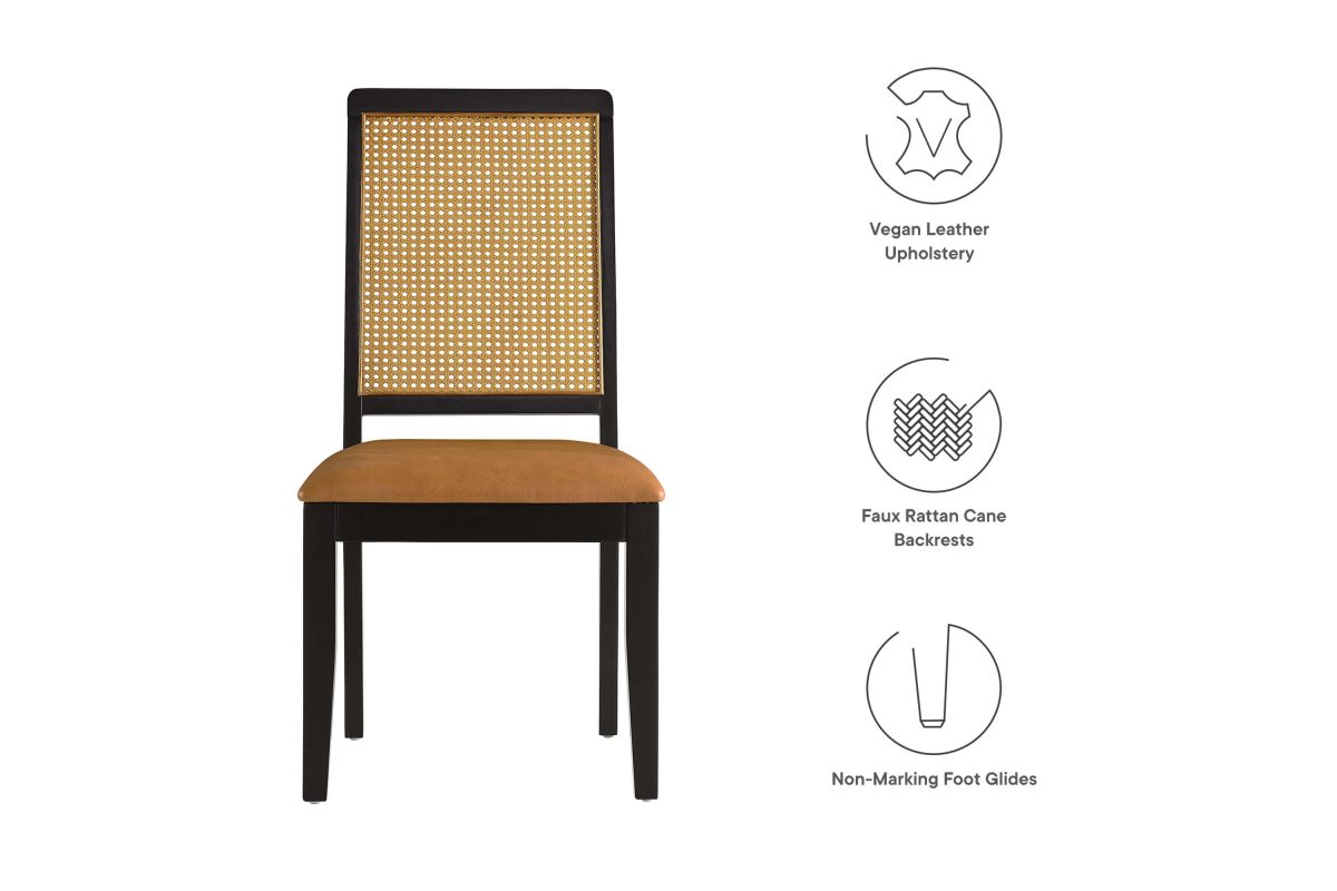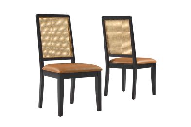 Discover the Arlo Dining Chair Set of Two, a stylish union of durability and design. These wood dining chairs boast expertly crafted faux rattan cane backrests, providing a breezy complement to the solid wood frames. Comfort is key with seats that feature dense foam padding enveloped in supple vegan leather. This set of 2 dining chairs includes non-marking foot glides protect floors from scuffs and scratches. The Arlo chairs seamlessly merge the rustic allure of farmhouse chairs with the sleekness of modern dining room furniture, making them ideal for use as both dining and accent chairs. Assembly required. Weight Capacity: 551 lbs.