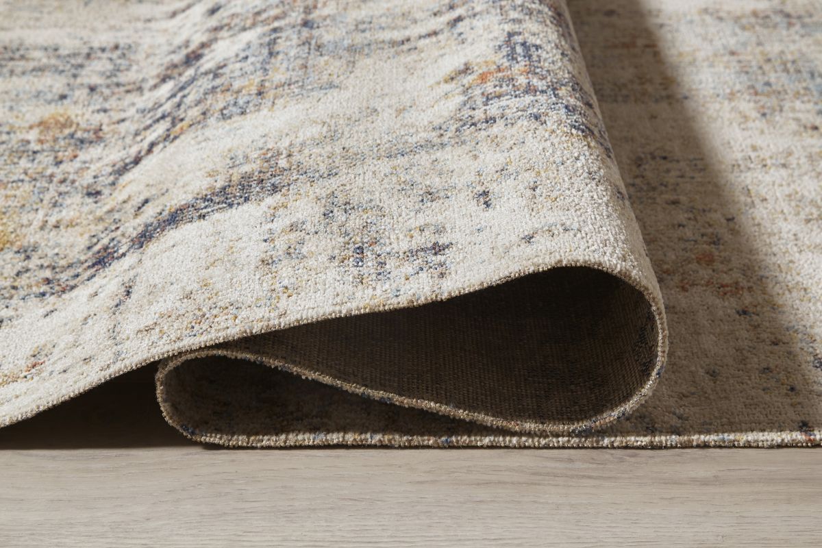 With its striking abstract pattern, this indoor/outdoor area rug leaves so much to the imagination. Its ethereal design, with shades of blue and hues of ivory, taupe, mustard and burnt orange, dresses up a room with brilliant color, visual texture and a highly contemporary point of view.