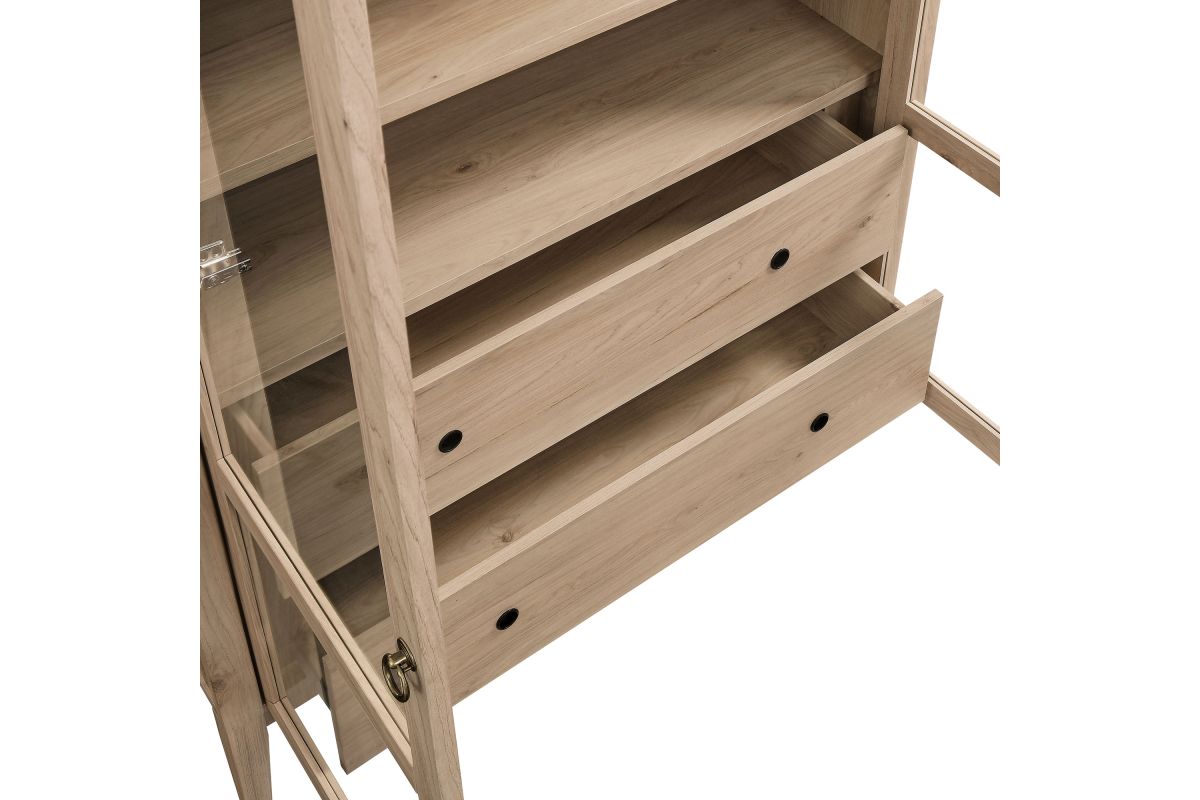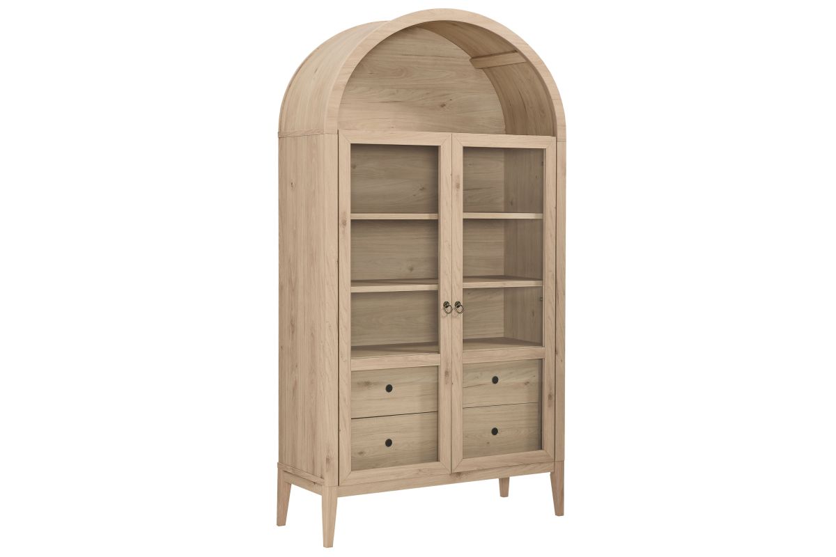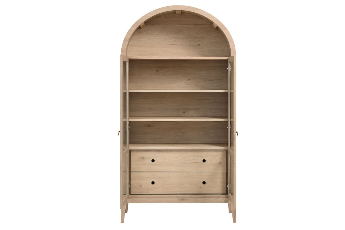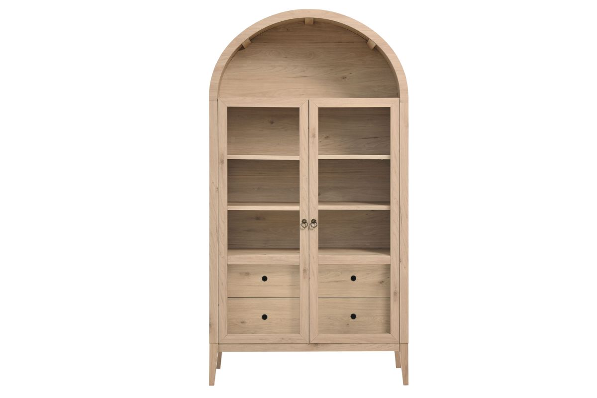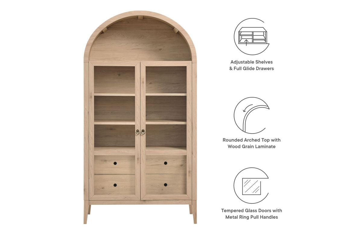 The Nolan Display Cabinet combines functional storage versatility with charming modern farmhouse style. Crafted with a beautiful wood grain laminate, the chic design flaunts subtle edge trimming and an elegantly rounded, arched top shelf. Supported by tapered wood legs, the Nolan tall storage cabinet boasts two doors with tempered glass windows that provide an open view to its interior. Inside the arched cabinet you�ll find two adjustable shelves, a fixed shelf, and two roomy full-glide drawers, offering plenty of storage space for displaying decorative items or for tucking away odds and ends. Complete with soft-close hinges and metal ring pull handles with a brushed gold finish, this wood storage cabinet is as stylish as it is practical. Perfect for your living room, hallway, or dining area, this arched bookcase effortlessly adds an air of sophistication and vintage allure to your home. To protect your flooring, this tall storage cabinet with doors comes equipped with non-marking foot pads. Assembly required. Weight Capacity: Arched Shelf: 88 lbs, Adjustable Shelves: 70 lbs, Fixed Shelf: 62 lbs, Drawers: 22 lbs