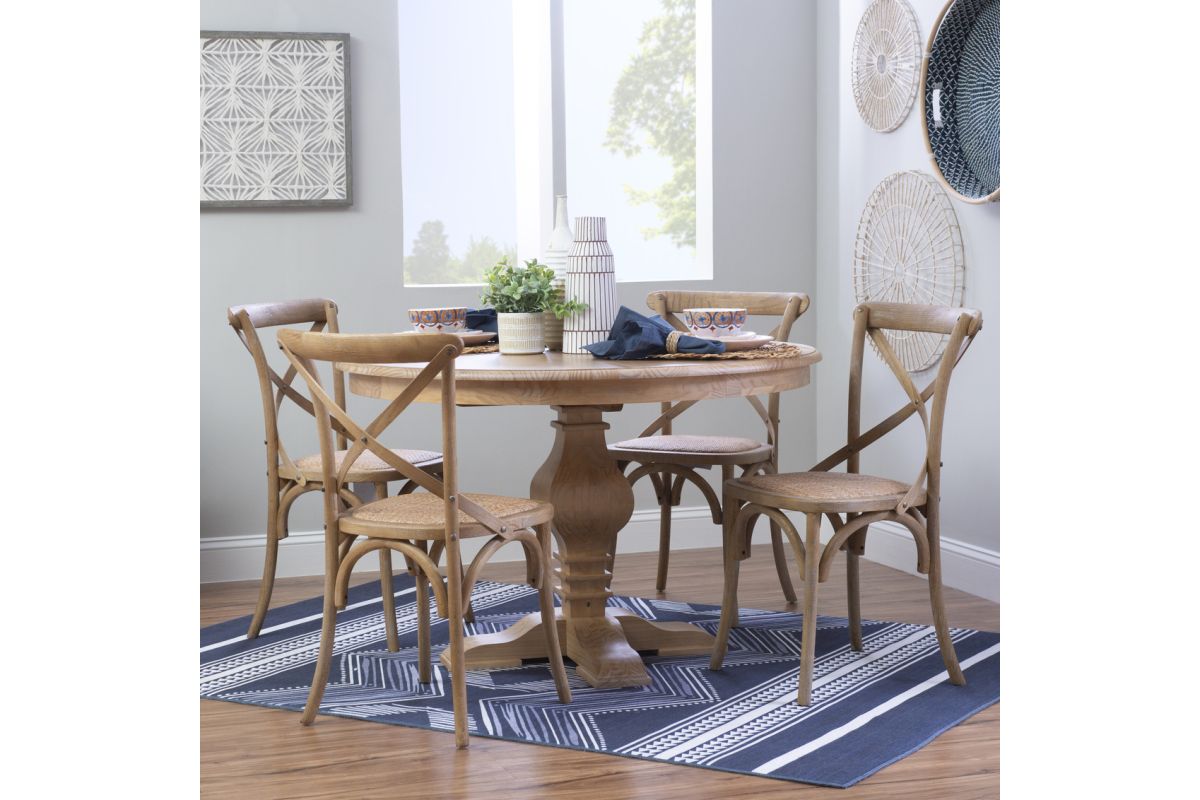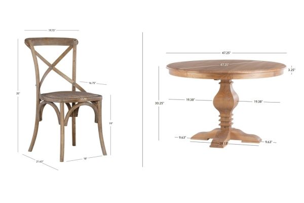 Enhance your dining area with our exquisite 5-piece round table dining set. Crafted from 100% elliotis pine, the table boasts a sturdy pedestal base and a natural finish that accentuates its intricate wood grain patterns. With a spacious 48-inch tabletop, it comfortably seats four for intimate meals or lively gatherings. The chairs feature curved wood details in a charming grey wash finish, embodying a vintage French country design. Despite their robust build, each chair weighs a light 14lbs, ensuring easy maneuverability without compromising on durability. Perfect for creating cherished dining moments with family and friends.