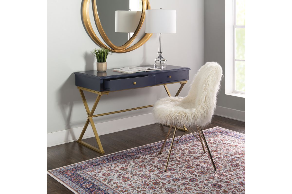 Work in style on the blue and gold campaign desk. The spacious top has a rich blue finish accented by the "x" styled matte gold legs. Small round gold knobs grace the front of the large storage drawer. Perfect for adding a pop of color and unique style to your office.