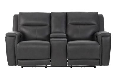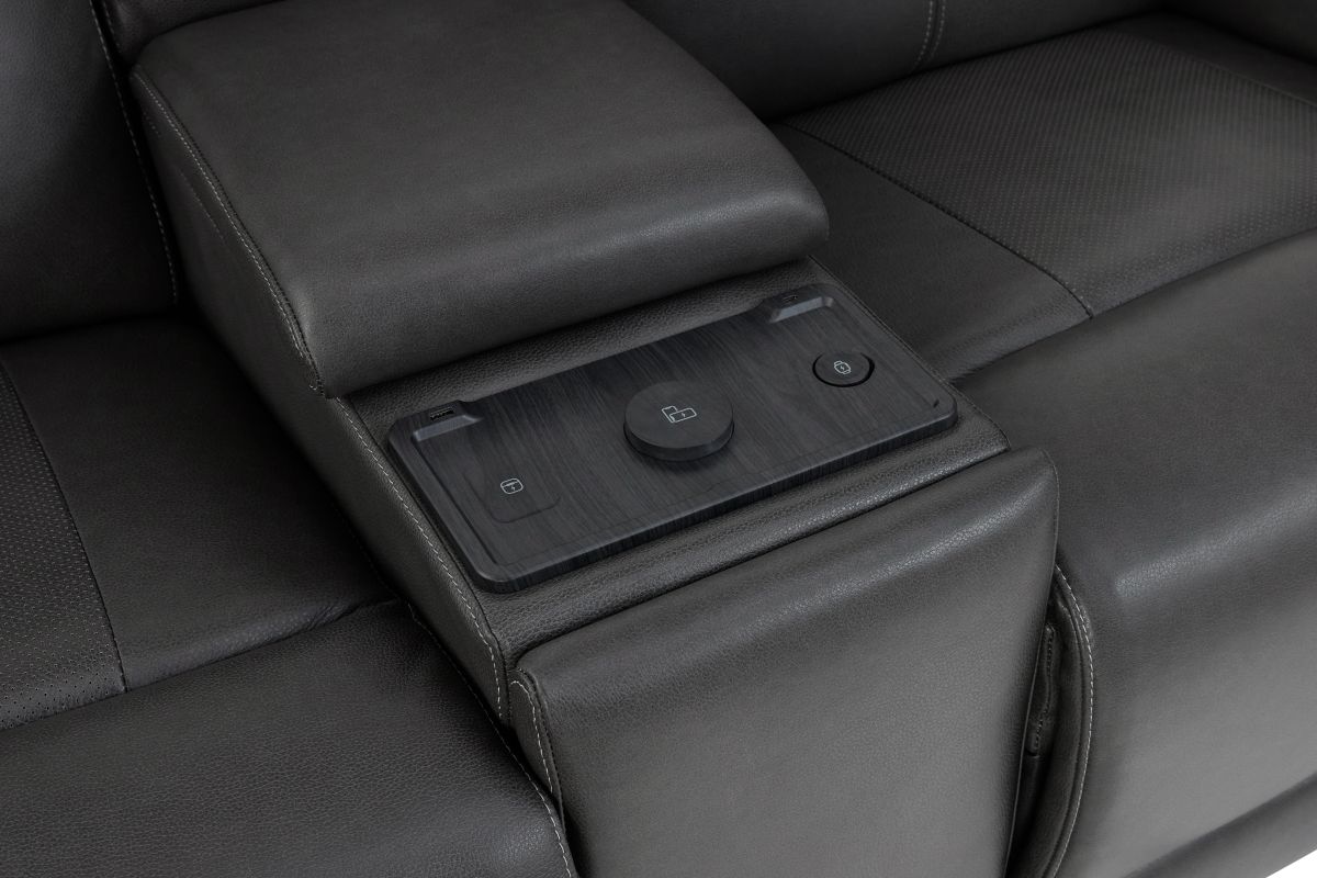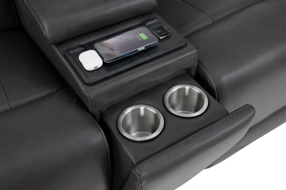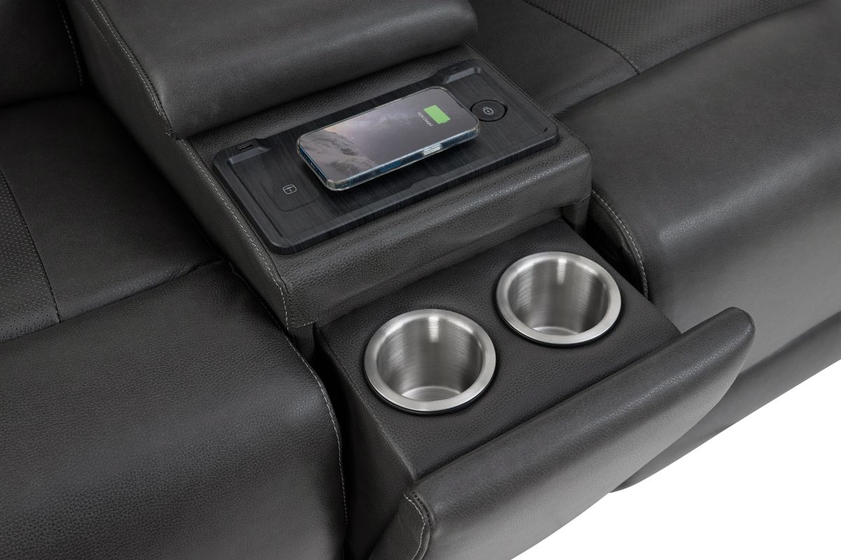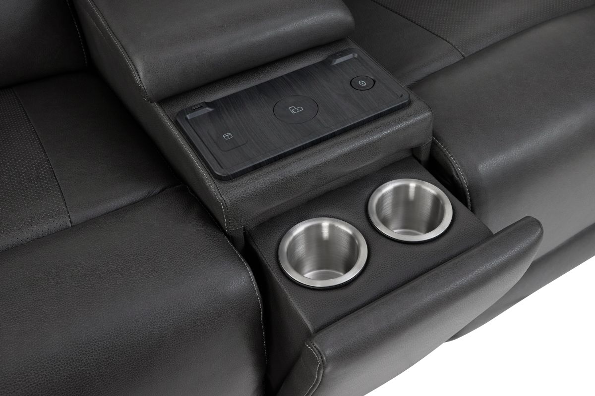 Experience comfort and convenience like never before with the Sonic Grey Dual Power Reclining Console Loveseat. Upholstered in sleek, premium leather, this loveseat combines modern design with innovative features to elevate your living space. Dual power reclining lets you independently adjust the headrest and footrest for customized relaxation, while the built-in audio system delivers rich sound that enhances movie nights, game days, or simply listening to your favorite music. The center console is designed with practicality in mind, offering storage, cup holders, and a wireless charging pad to keep your devices powered without the hassle of cords. Perfect on its own or as part of the Sonic Grey collection, this loveseat completes your seating area when paired with the Sonic Grey Dual Power Reclining Sofa or the Sonic Grey Dual Power Recliner, creating a seamless blend of style, technology, and total comfort.
