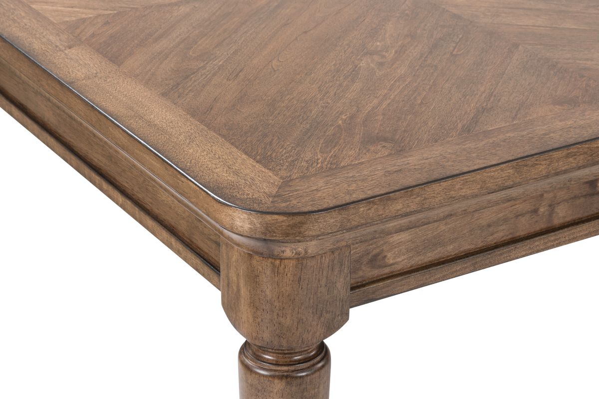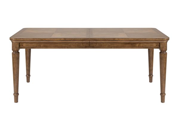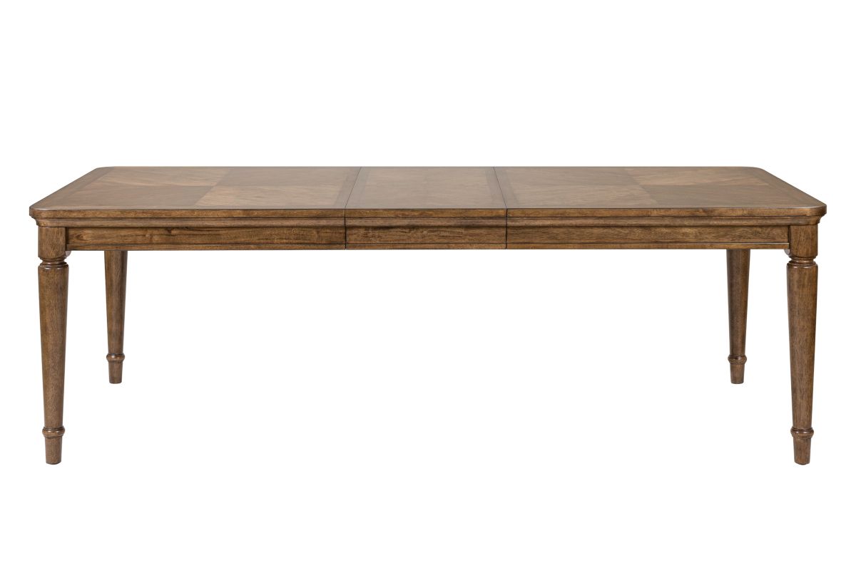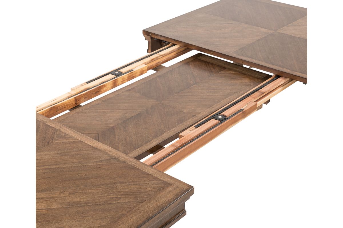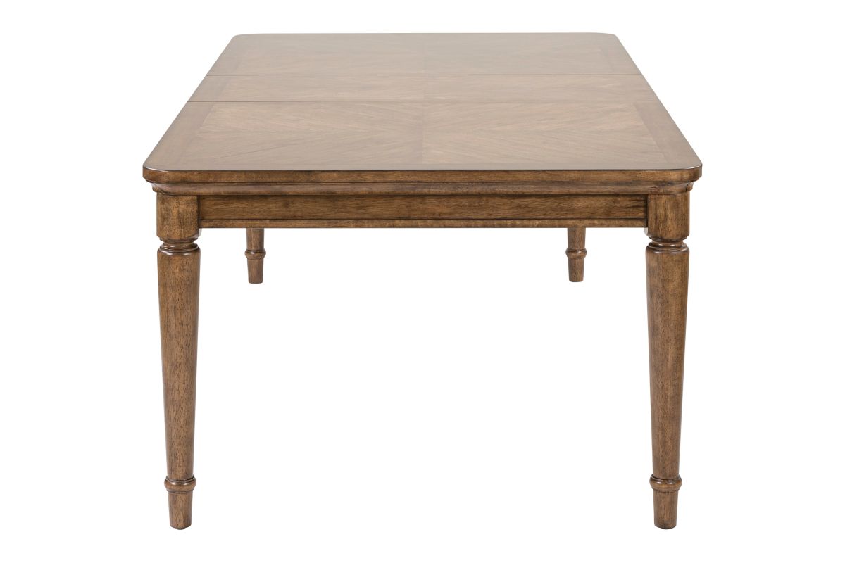 The Tuscany Collection brings timeless design and thoughtful craftsmanship to your dining space. Featuring softly rounded corners, saber chair legs, and subtle wood frame accents, each piece is rich in detail and comfort. Premium touches like antique brass knobs, felt-lined top drawers, and a removable silverware tray enhance function and elegance. A self-storing 18-inch leaf with an easy-glide track system and 4-way matched fancy face veneer add both beauty and versatility to every gathering.