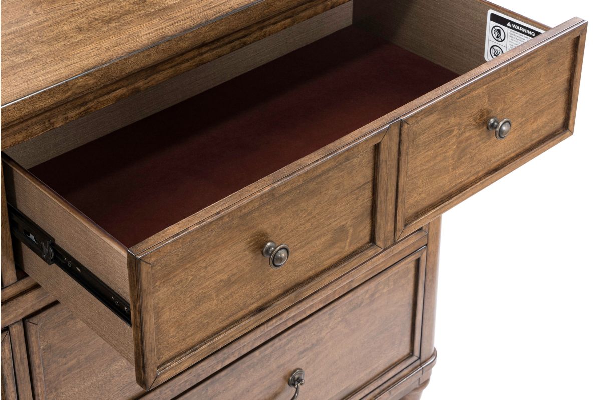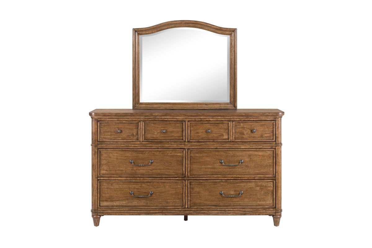 The Tuscany Dresser & Mirror is expertly crafted from birch solids and veneers, ensuring both strength and natural beauty, with warm brown finish with subtle texturing that enhances the wood’s natural grain. With a combination of classic knobs and elegant drop pulls for a vintage-inspired look. The matching mirror features a beveled edge for added depth and sophistication, framed in the same wood finish with a graceful arched crown.