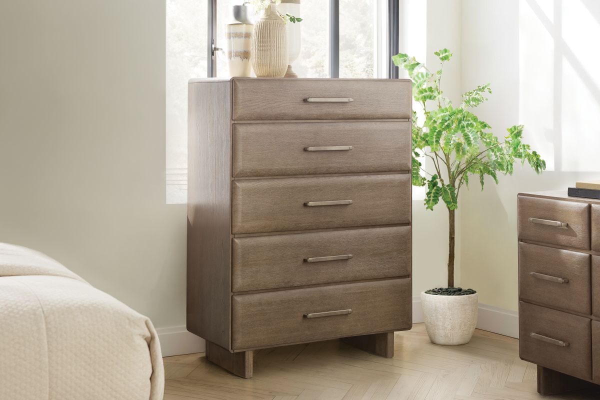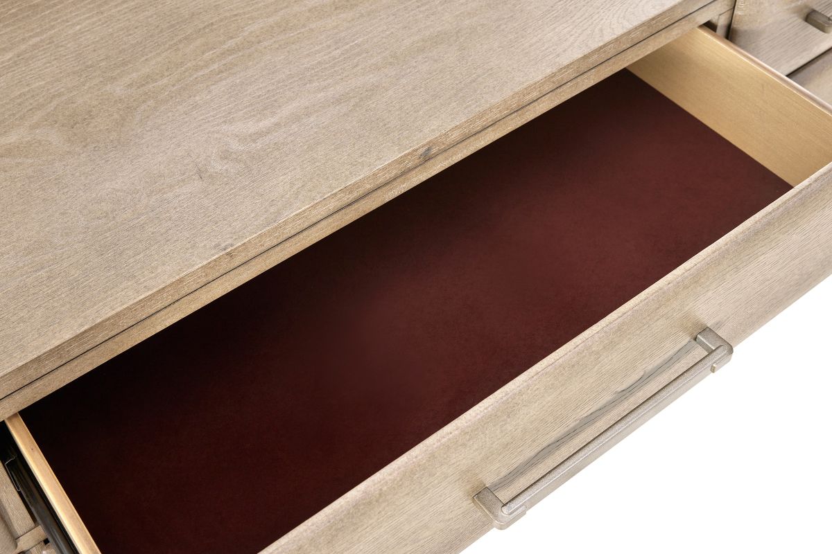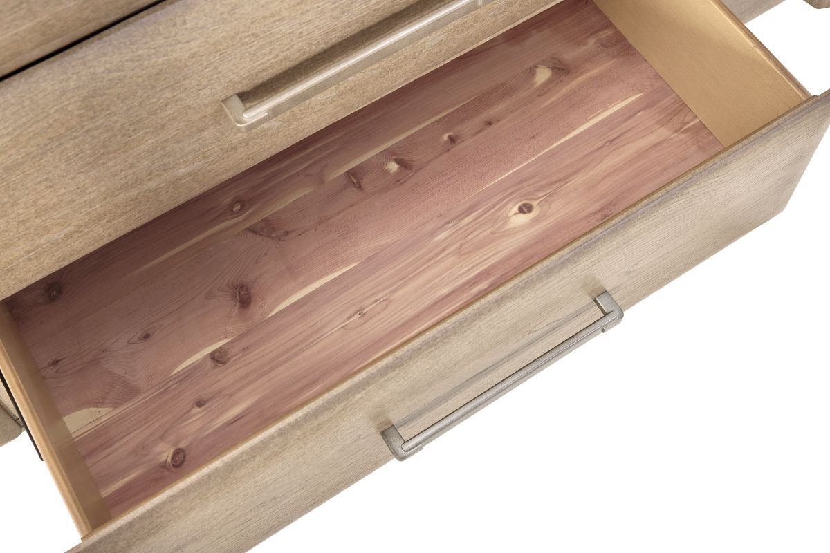 Discover the perfect harmony of classic elegance and modern innovation with the Bentley collection. Crafted with oak-embossed birch veneer in a refined White Oak finish, this collection brings natural texture and warmth to any bedroom. The upholstered panel headboard offers a soft, tailored accent, while cedar-lined bottom drawers provide luxurious, aromatic storage.