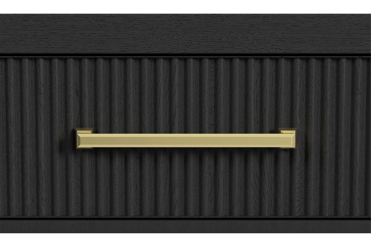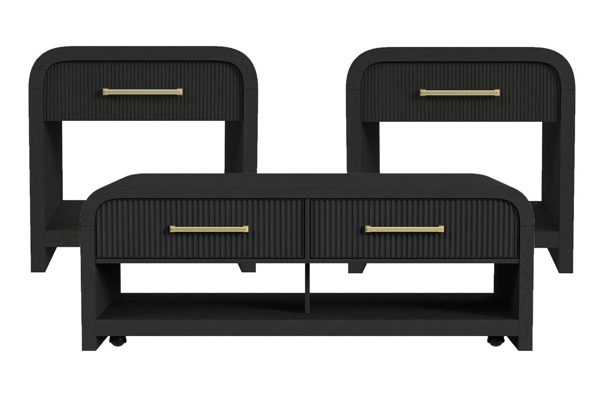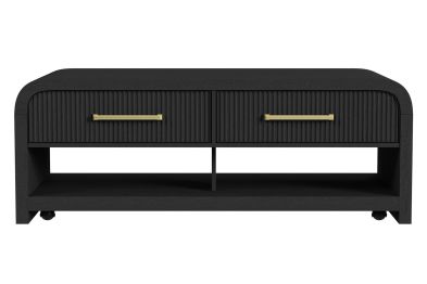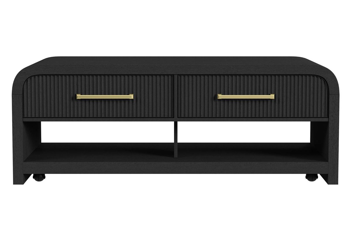 Sophisticated style meets everyday functionality with the Ridgemont Black Grain Coffee Table. Designed with a striking black finish accented by subtle wood grain, this piece features sleek rounded edges and vertical reeding for a touch of texture and modern flair. Two spacious drawers offer hidden storage, while the open lower shelf provides easy access to books, décor, or media essentials. Built-in casters make it easy to move, giving you flexibility for entertaining or rearranging your space. For a cohesive look, pair it with the matching Ridgemont Black Grain Side Tables to complete your living room ensemble.