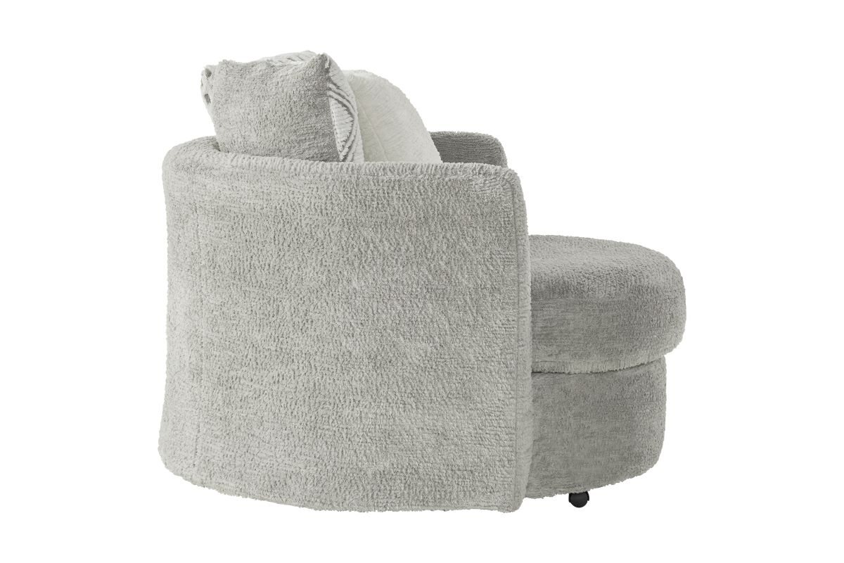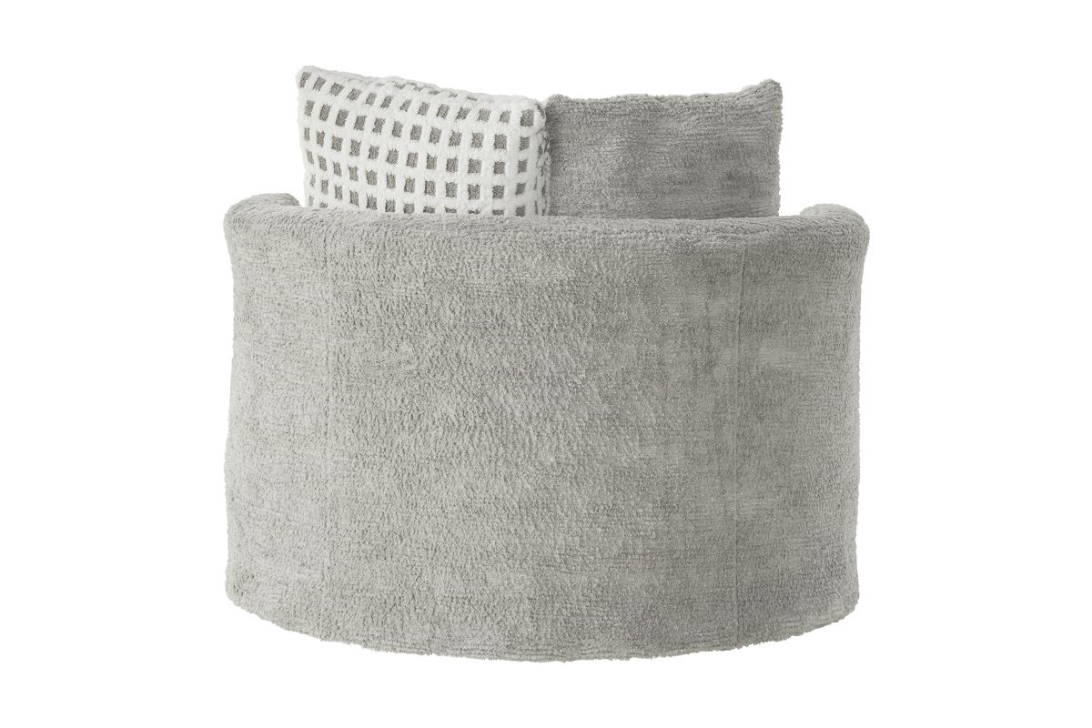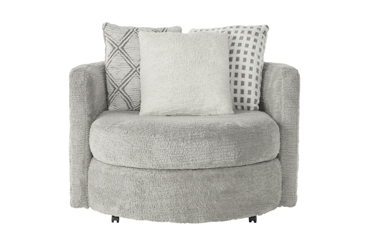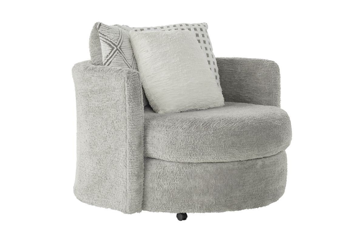 Designed for comfort and movement, the Haven Swivel Chair features plush, oversized cushioning and a smooth swivel base that lets you turn with ease—whether you’re joining the conversation, reaching for your favorite book, or finding the perfect view of the TV. Its rounded silhouette and designer accent pillow create a modern yet inviting look that blends seamlessly into any room.