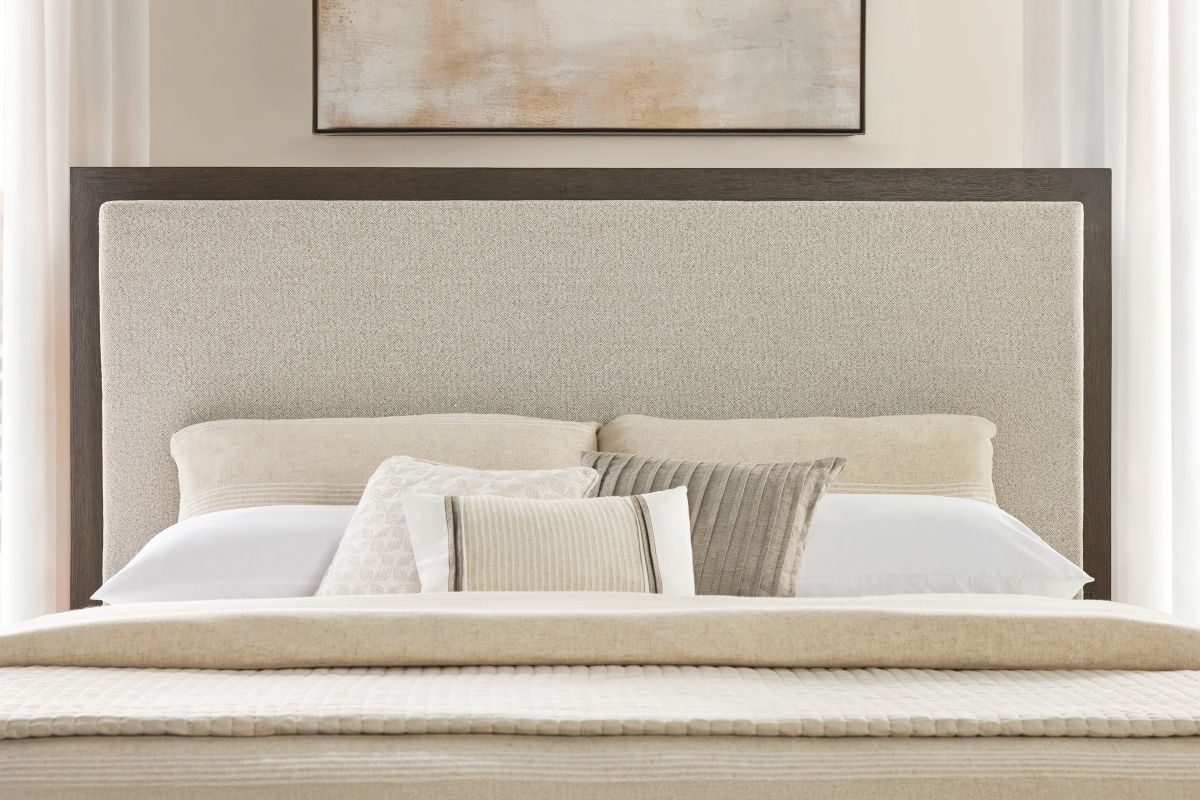 - Headboard has inset upholstered panel framed in wire-brushed oak in Cassel finish