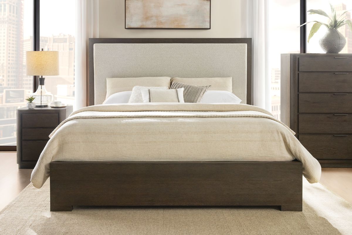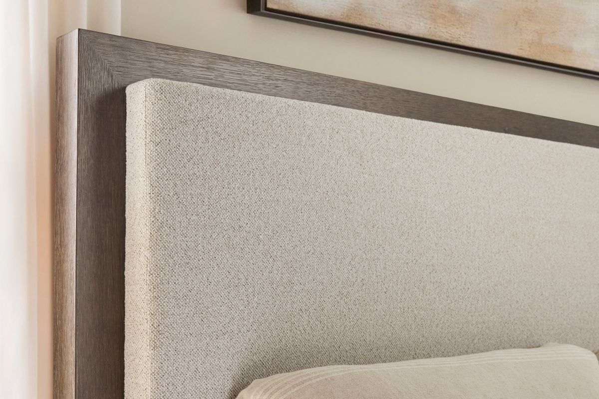 - Headboard has inset upholstered panel framed in wire-brushed oak in Cassel finish