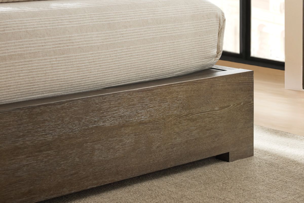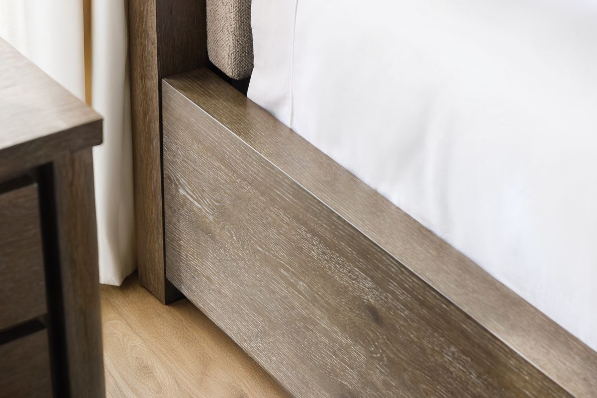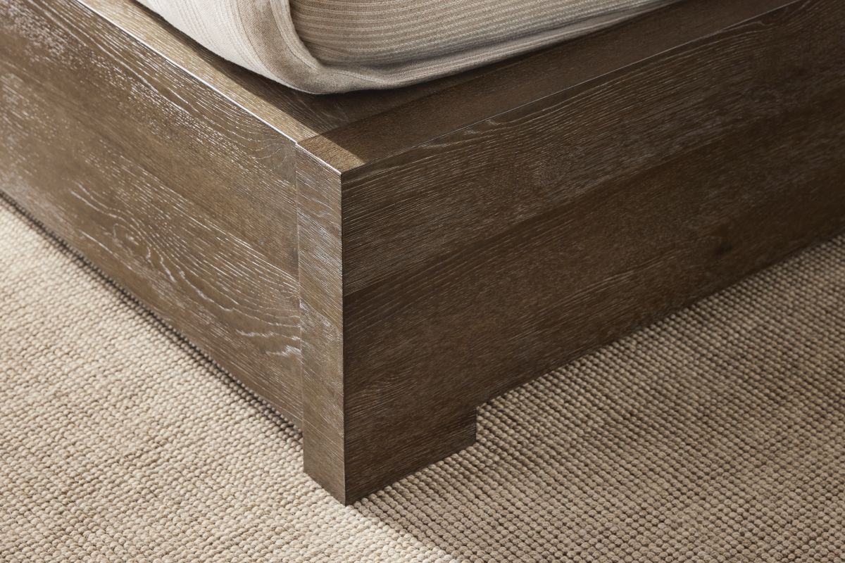 Deeply textured wood crafts a compelling frame for the Outline panel bed. Finished in Cassel, the headboard offers comfort with a raised and upholstered panel. Bold wood shapes extends around the bed to the footboard, ending in slim block feet.