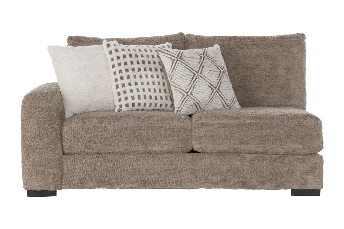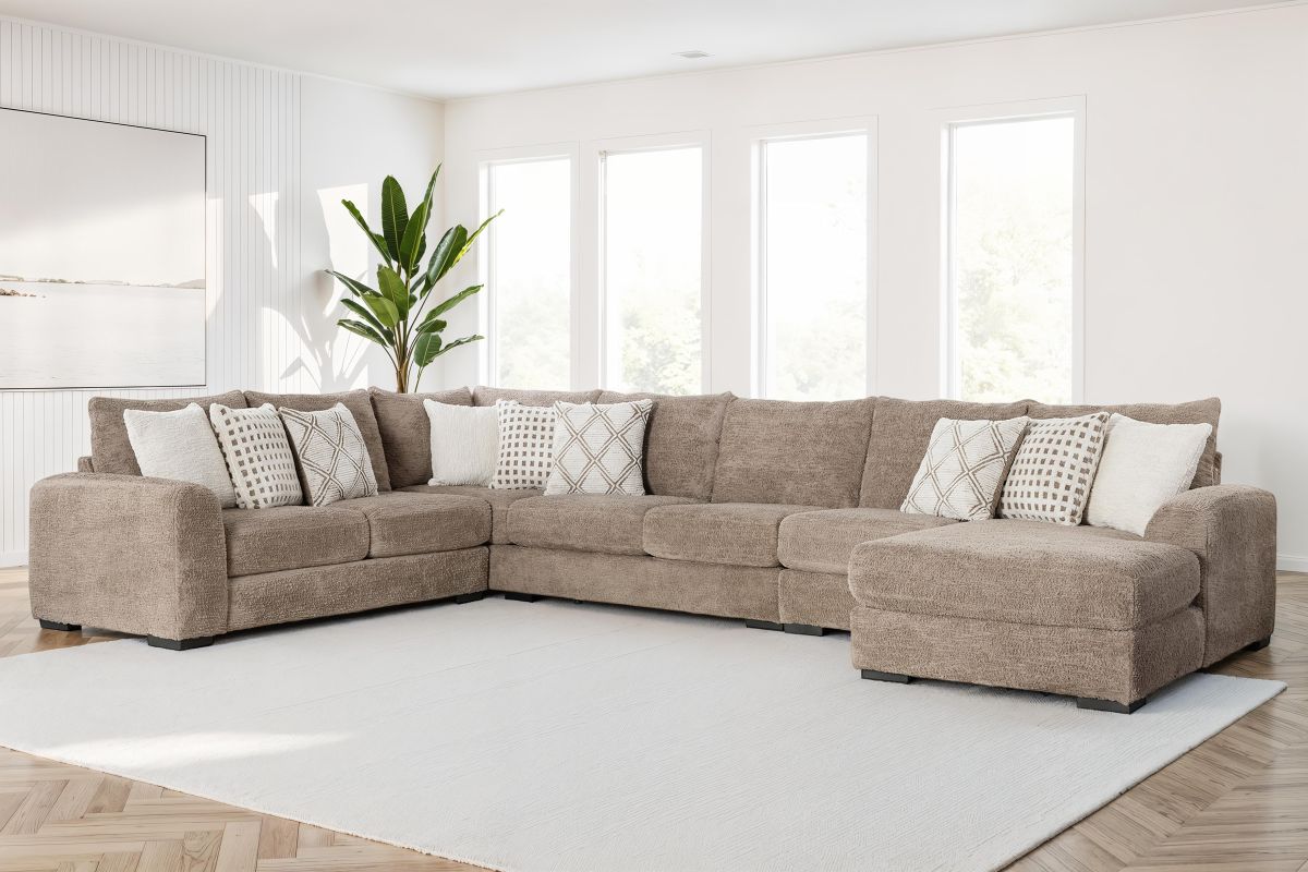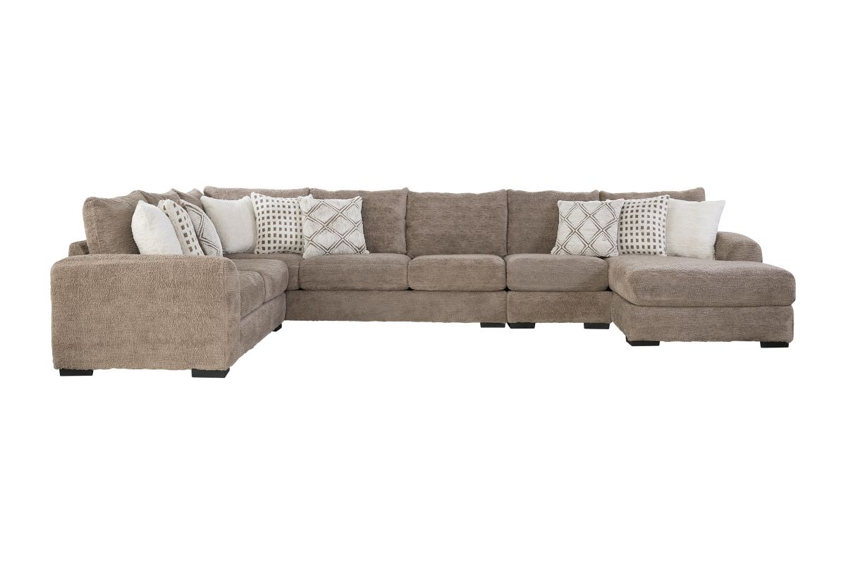 Stretch out in style with the Haven Cocoa 4-Piece Sectional with Right-Arm Facing Chaise. Upholstered in ultra-soft chenille fabric, this piece delivers the perfect mix of cozy comfort and contemporary design. The warm cocoa hue creates an inviting atmosphere, while deep seating and plush cushions provide plenty of room to lounge, relax, and unwind.