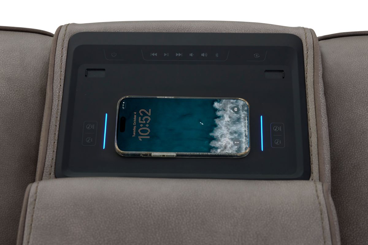 The centerpiece of this loveseat is the Okin audio table, engineered with immersive audio through dual built-in speakers for a rich, theater-like sound experience. The table also features mass vibration, wireless charging, and both USB-A and USB-C ports for seamless device connectivity.