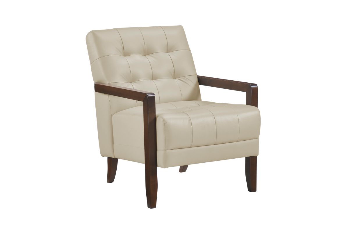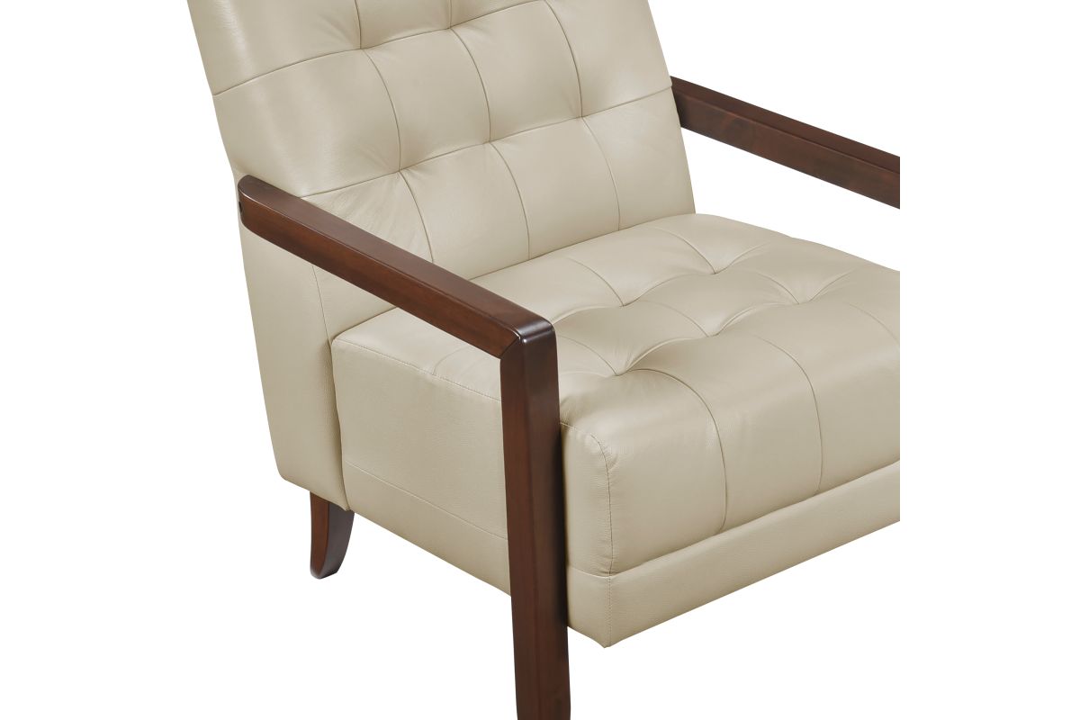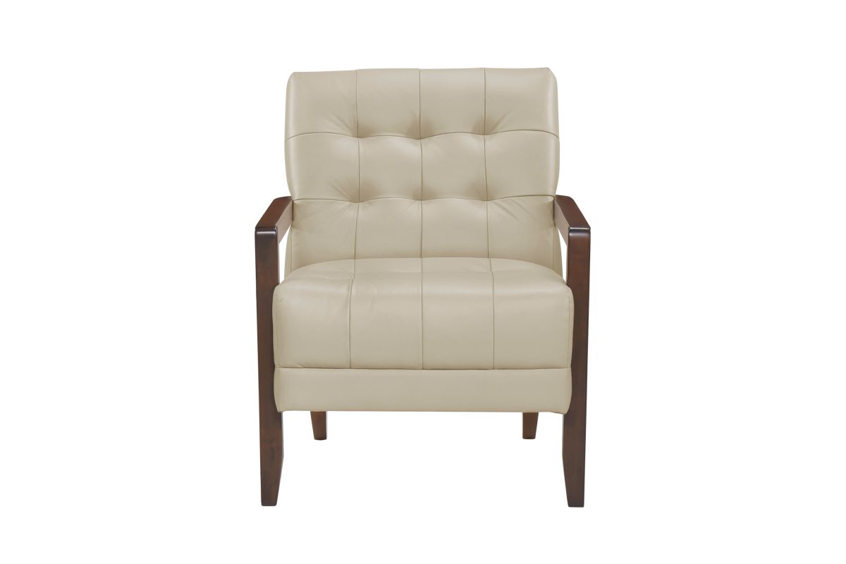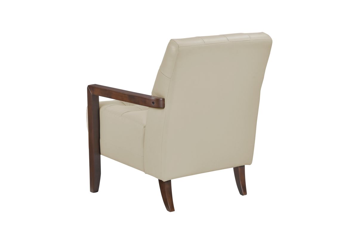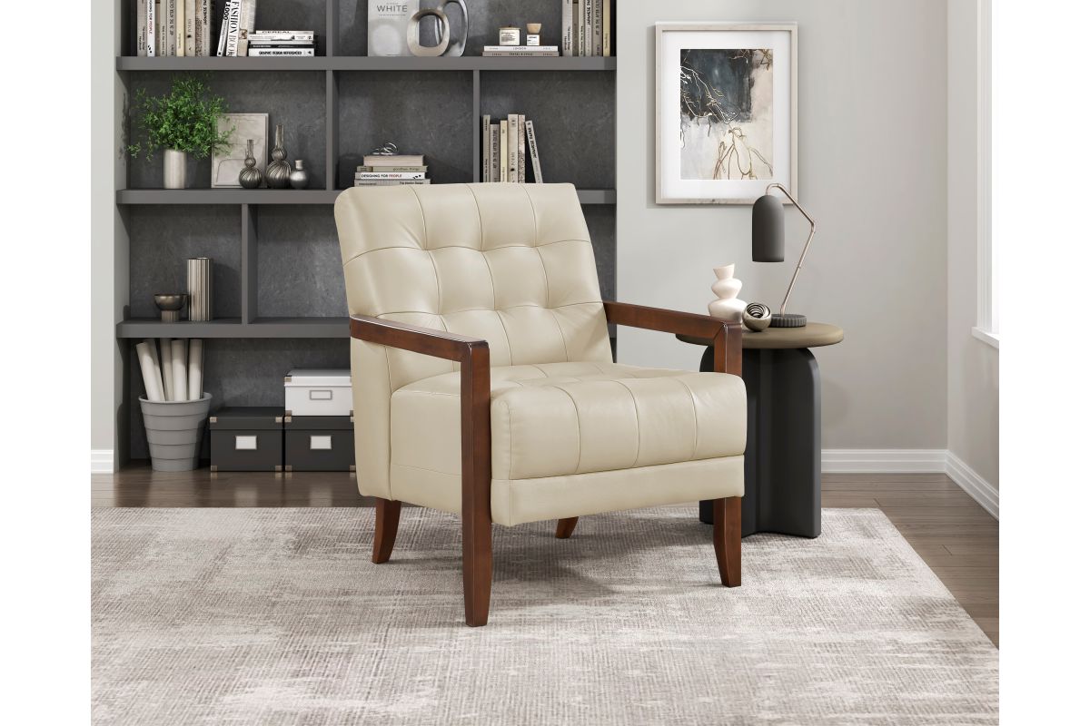 Elevate your living space with this top grain leather match accent chair, designed for timeless elegance, premium comfort, and lasting durability. Featuring a mid-century modern silhouette, deep tufted detailing, and a solid wood frame with sleek armrests, this chair blends sophisticated style with everyday functionality. The plush, high-density foam cushioning provides exceptional support, while the top grain leather match upholstery offers a luxurious look and soft, supple feel. Built with sturdy wooden legs and reinforced construction, this accent chair is perfect for living rooms, home offices, reading nooks, or bedroom seating, adding a touch of refined charm to any decor.