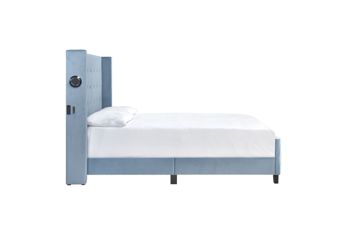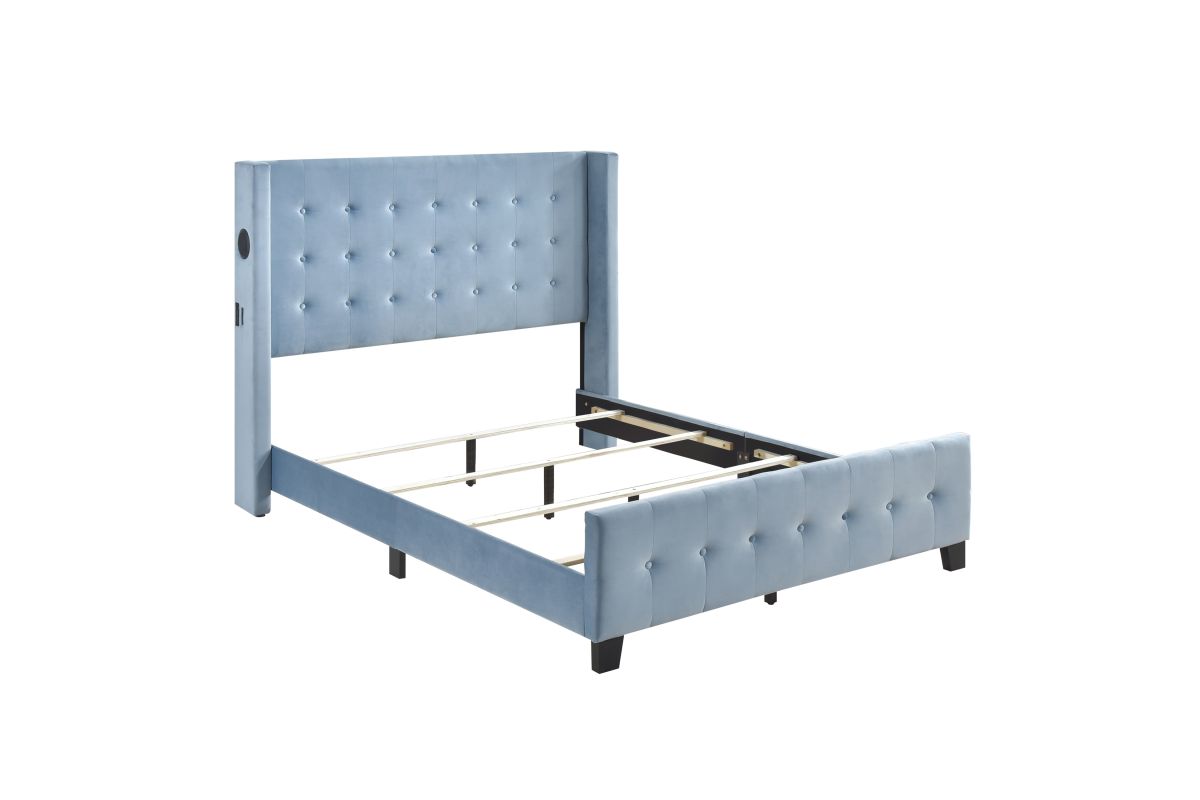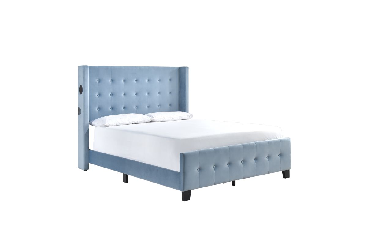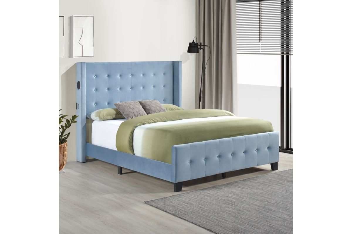 Experience the perfect blend of luxury and modern convenience with the Darius King Bed by Home Elegance. Featuring a plush, tufted blue velvet headboard, this king-sized bed adds a touch of elegance to any bedroom. Built-in speakers and USB/Type-C ports let you enjoy your favorite music and keep your devices charged right at your bedside. Elevate your sleep space with style and smart functionality in one stunning design.