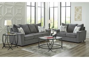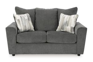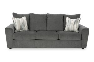 What's new in neutrals? Shades of gray, of course. Embrace the sophisticated design trend with this gorgeous sofa, which offers a clean-lined, contemporary style at a comfortably cool price. Sure to lift your spirits, the plush chenille fabric is fabulously neutral. Modern flared arms give it a distinctive flair. This sofa also arrives with two cool brushstroke accent pillows to elevate the taste and comfort level.