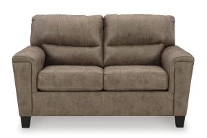 If you love the cool look of leather but long for the warm feel of fabric, you can take comfort in this loveseat. Wrapped in a fabulous faux leather with a weathered hue and hint of pebbly texture to resemble the real deal, this decidedly modern loveseat proves less is more. Elements include angled side profiling and track armrests wrapped with a layer of pillowy softness for that little something extra. Prominent jumbo stitching and clean-lined divided back styling lend fashion-forward flair.