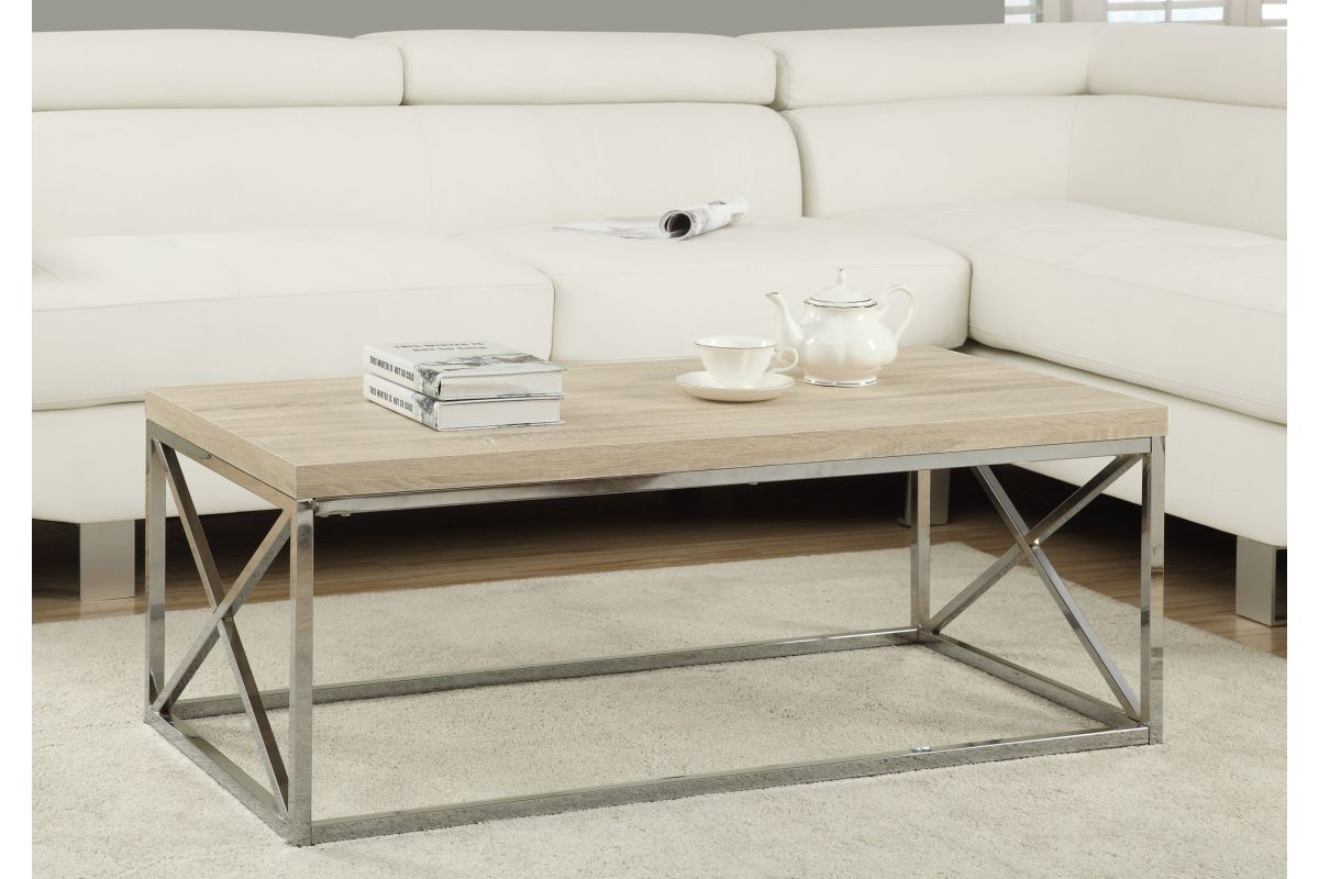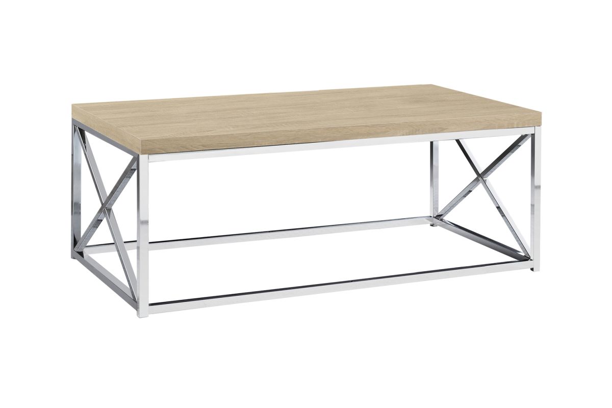 Inspired by clean lines and a simplistic, yet modern feel, this natural wood look and chrome metal coffee table offers a contemporary allure that will make you feel comfortable in your living room, office space or den. With the smoothest of thick panel surfaces, its pine finish brightens up your living space, while the criss-cross chrome metal legs are both sturdy and shiny to complement the table top. Add this stand-out center table to small home, condo or apartment's decor collection now!