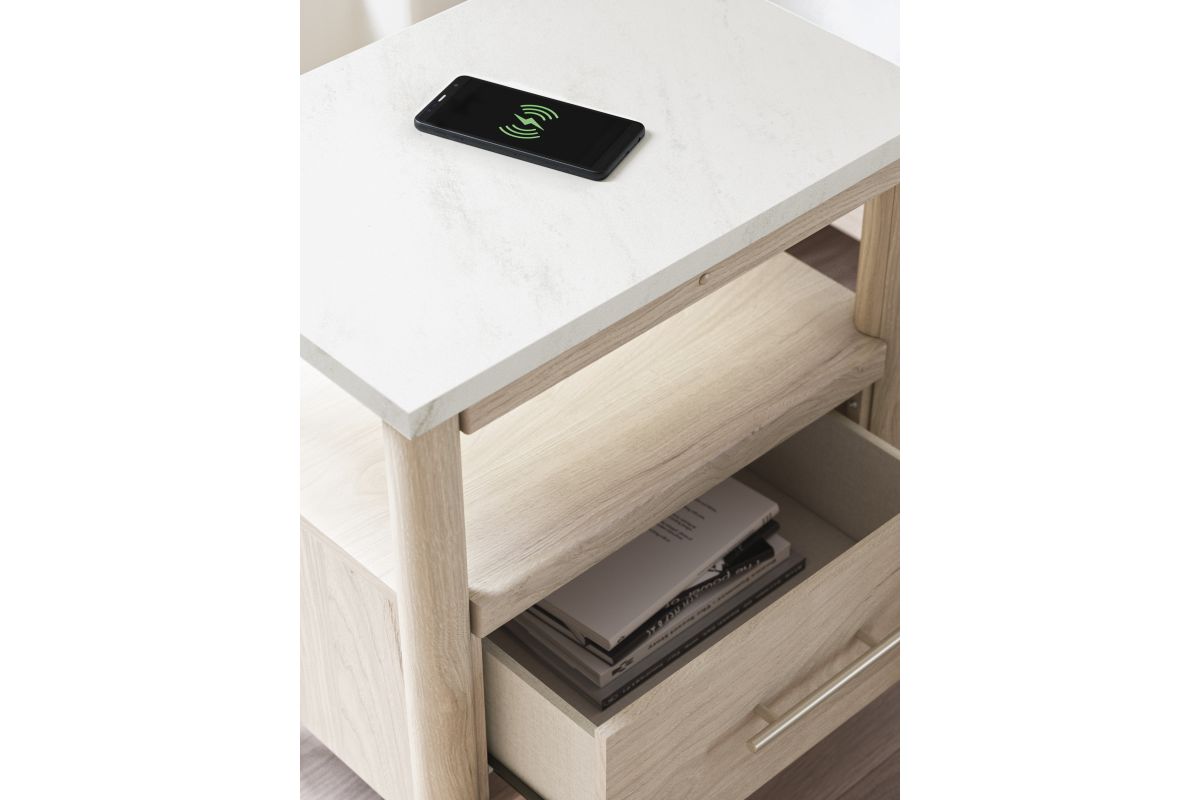 Transform your bedroom with this nightstand. With its clean lines and replicated marble top, it exudes a minimal and sophisticated boho style. Built-in lighting and charging capabilities add simplicity and ease to your everyday tasks. Tailor your space and create the perfect environment for sweet dreams.