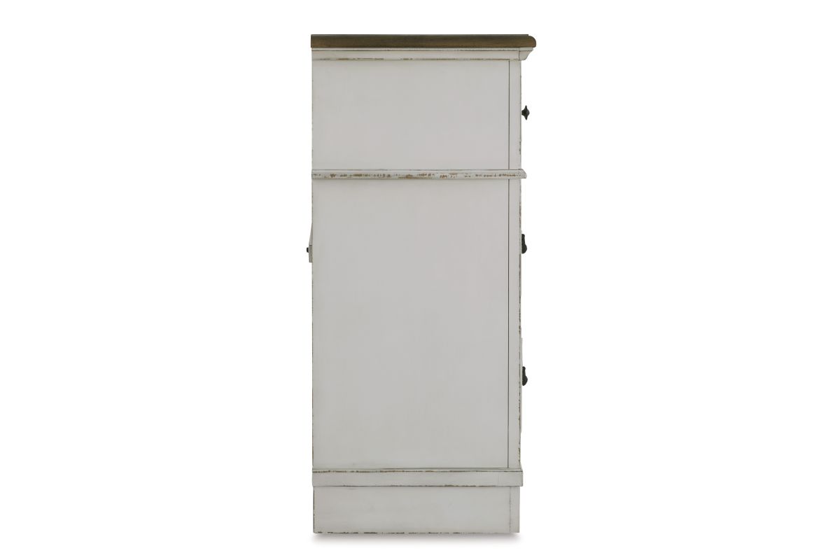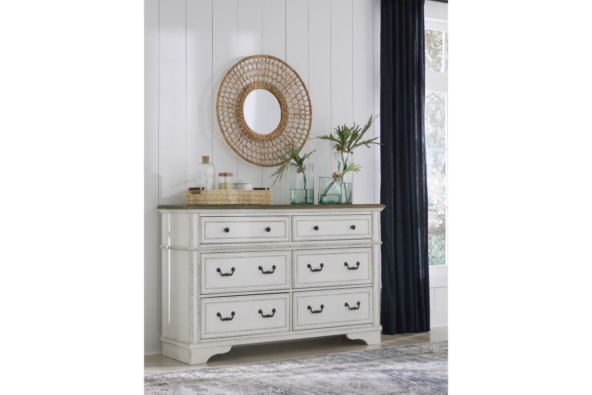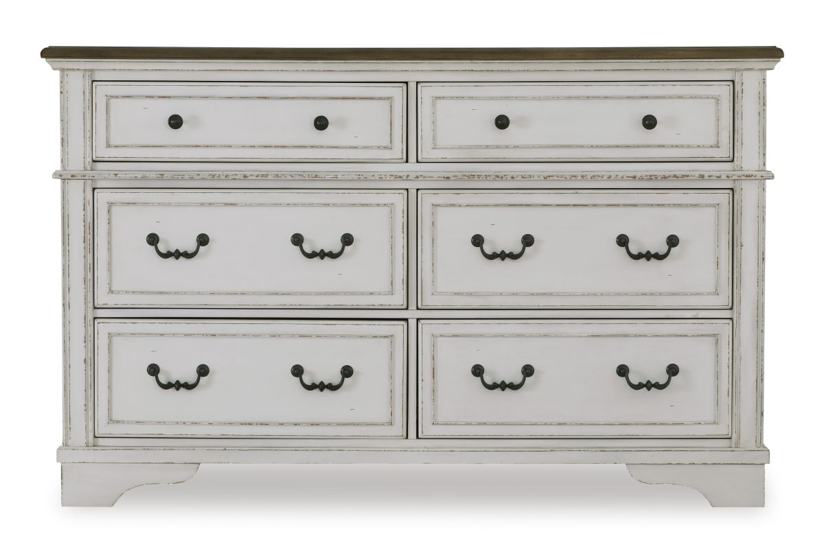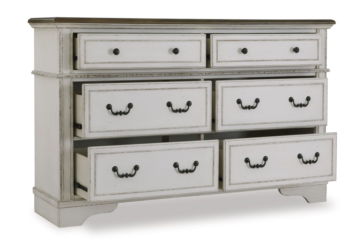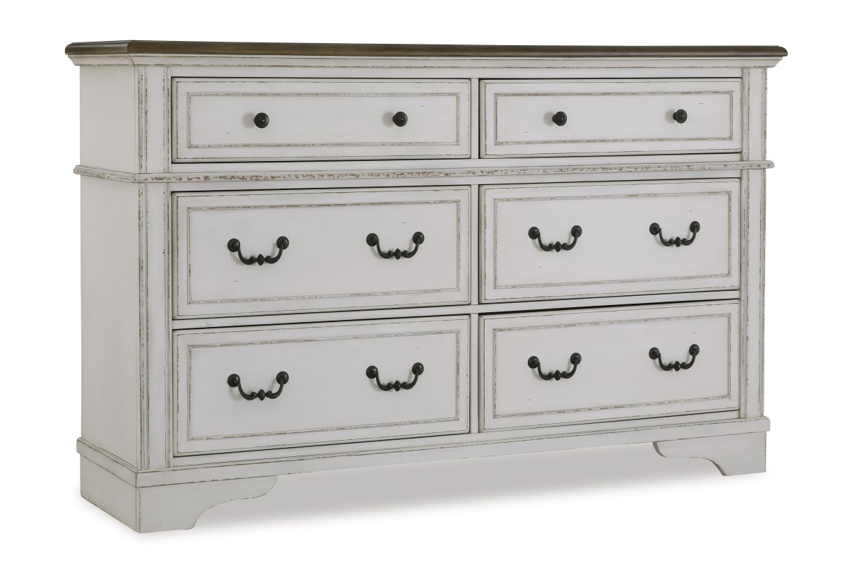 Traditional design. Casual appeal. You can have it all with this dresser. A relaxed two-tone aesthetic merges with ornate profiled drawer fronts and pilasters to give the distinctive piece an allure all its own. Expansive drawers with quality dovetail construction and dark bronze-tone hardware reflect attention to detail from the inside out. Assembly Required.