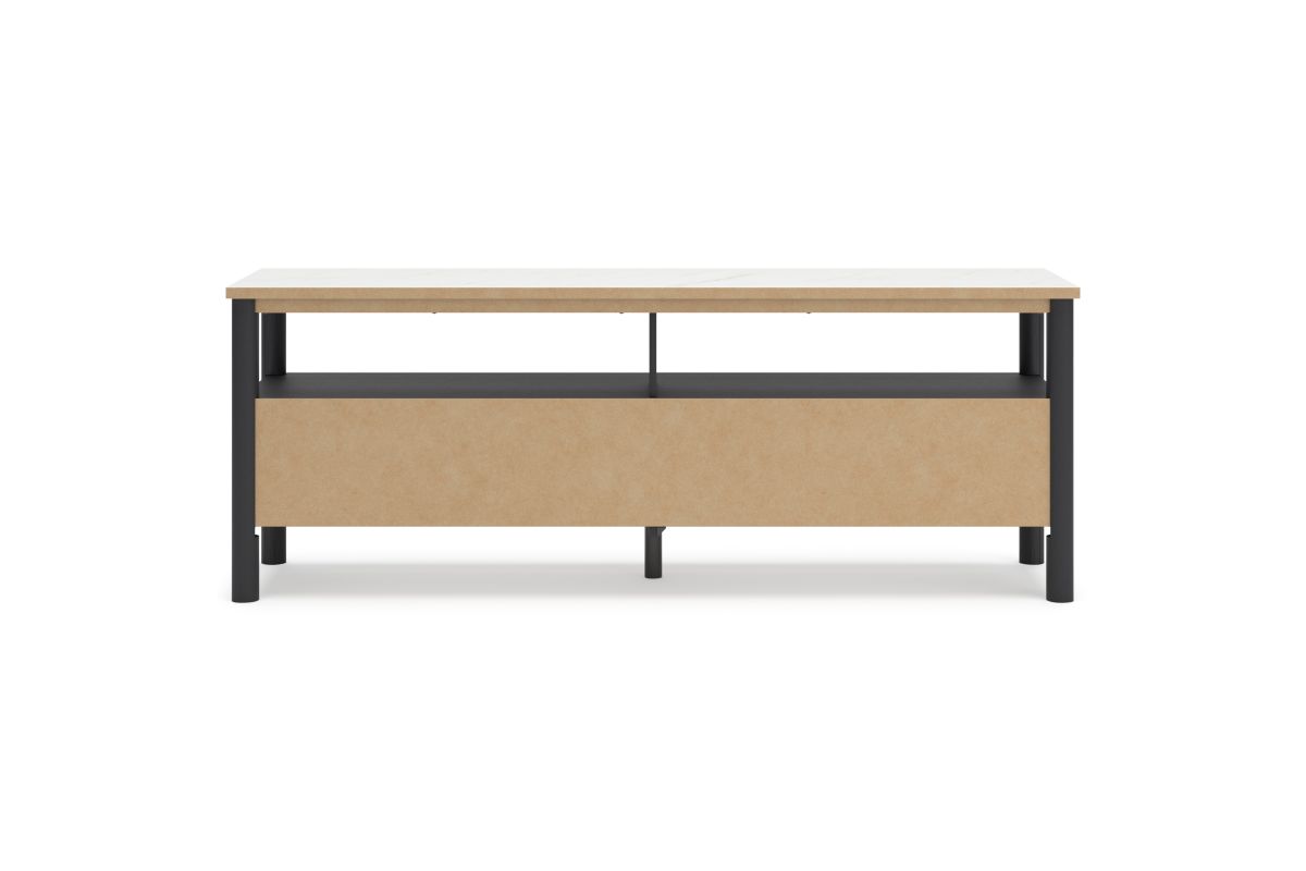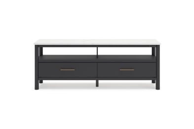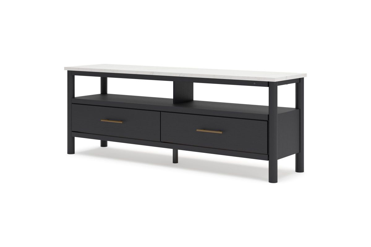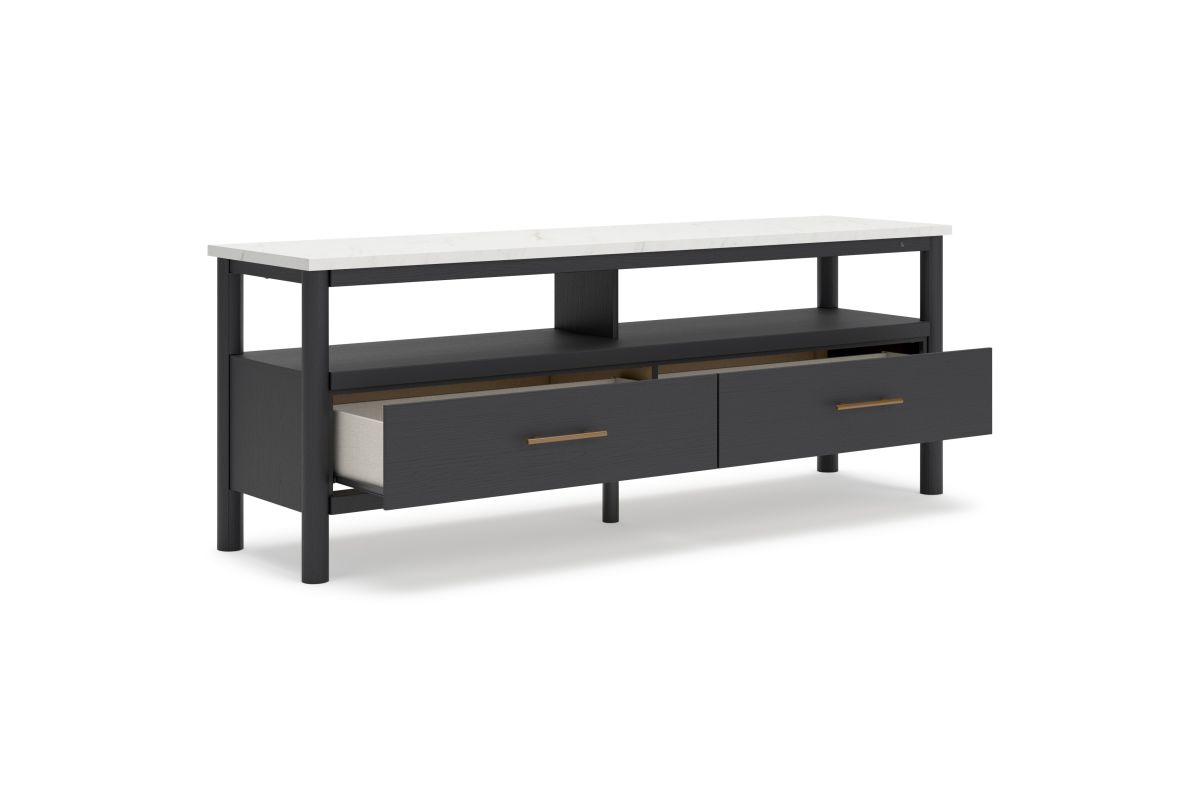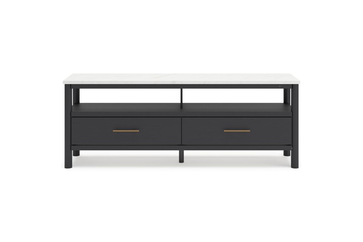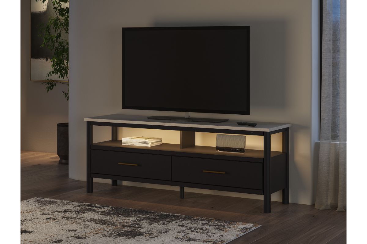 This TV stand reflects your sophisticated approach to boho style. Crafted with both form and function in mind, its replicated marble top beautifully contrasts a matte black finish. Ambient lighting and drawers for media storage make it a chic and convenient living room companion. And the versatile design suits all-neutral spaces or blends with your favorite pops of color. It's inviting, yet posh. Luxe, yet laid-back. With this TV stand, your free-spirited vibe meets modern design. Assembly Required.