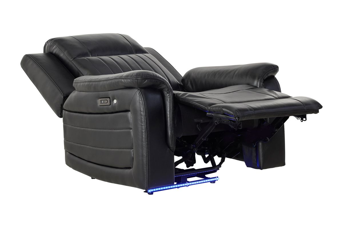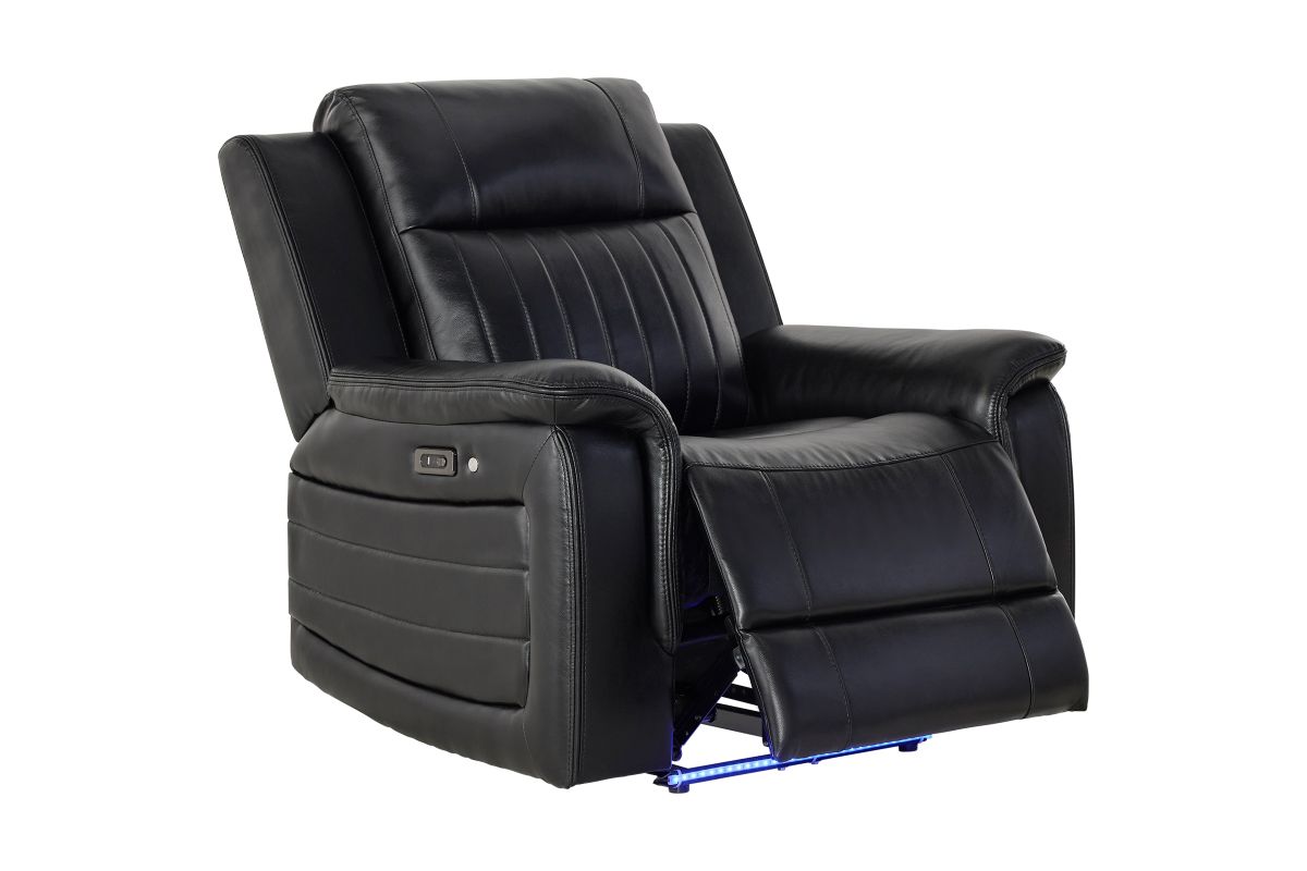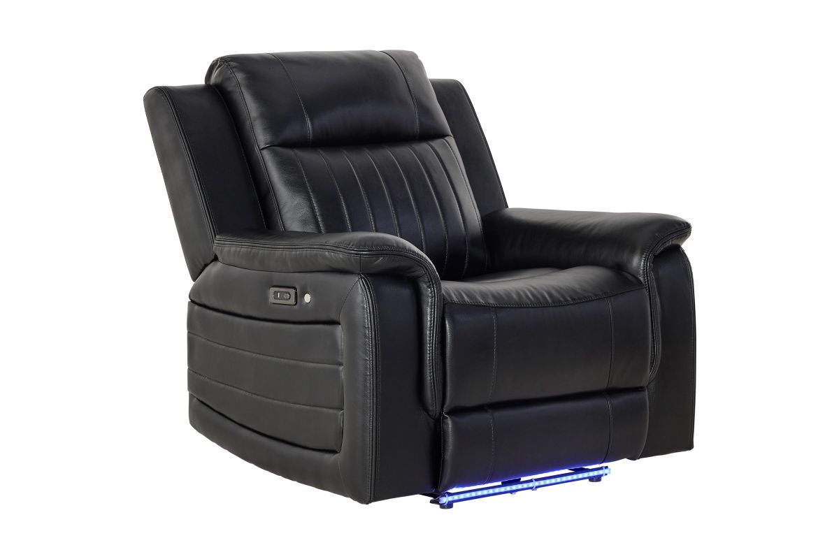 The Sync Power Recliner combines modern comfort with tech-enhanced design, featuring smooth power reclining and a sleek black upholstery finish. Its base is accented with a striking blue LED light, adding a stylish glow that elevates any entertainment space. Designed for relaxation, this recliner offers supportive seating and easy operation, making it the perfect spot for gaming, movie nights, or winding down in comfort and style.