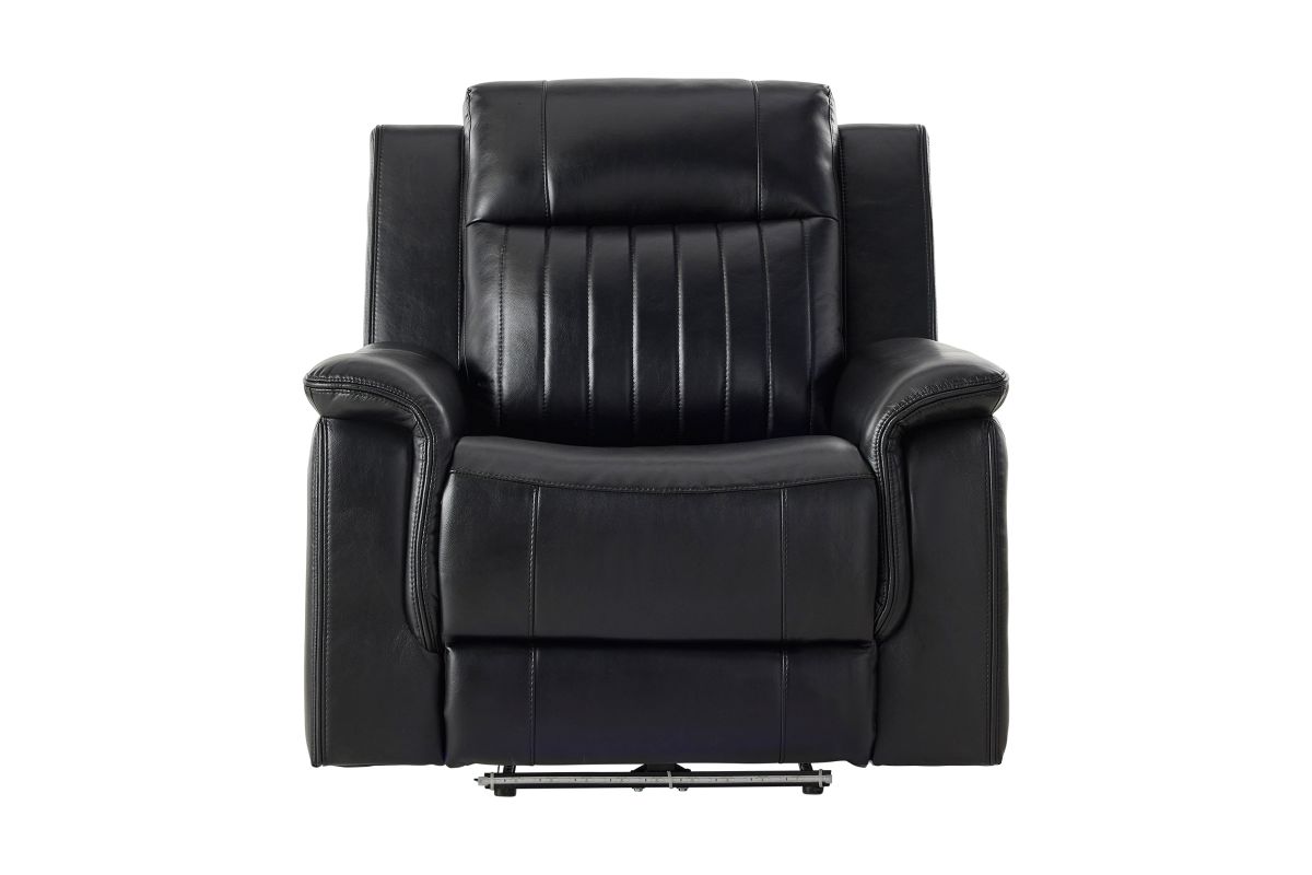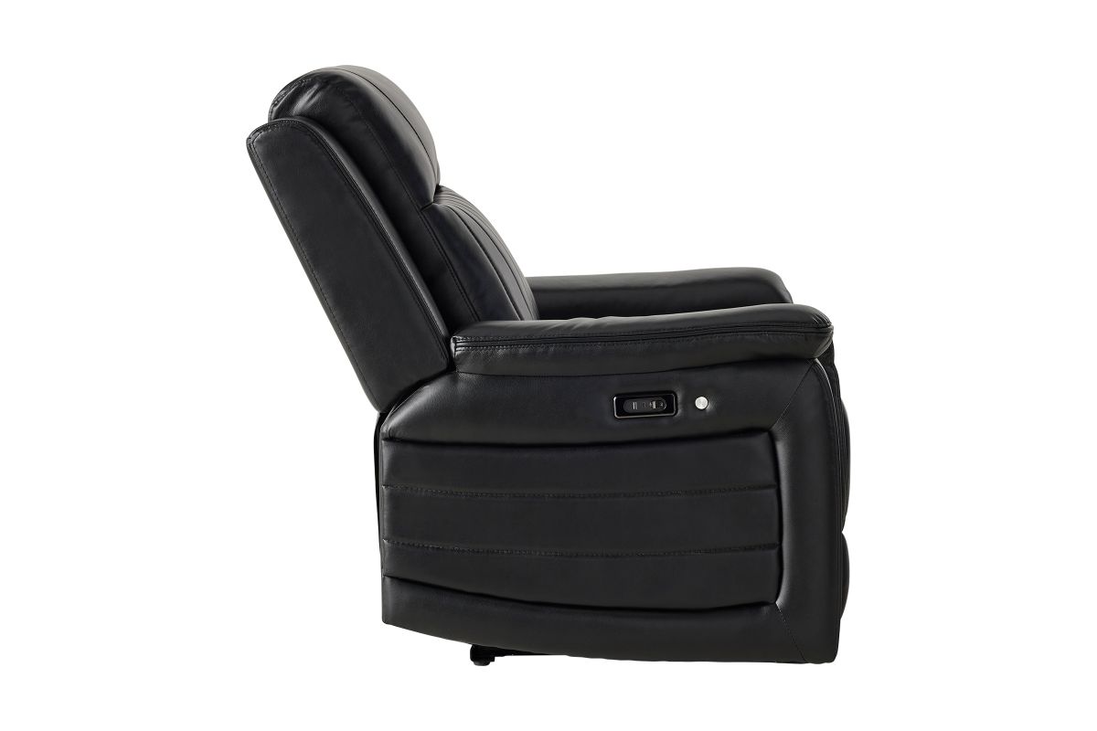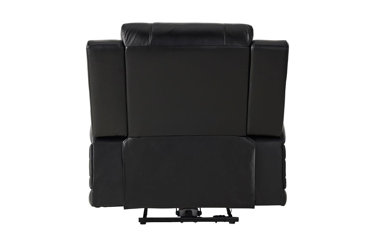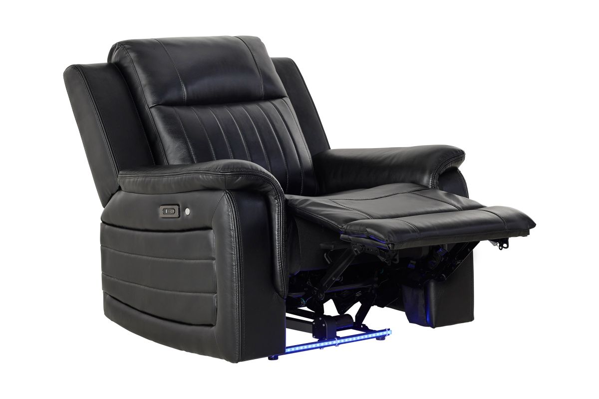 The Sync Power Recliner combines modern comfort with tech-enhanced design, featuring smooth power reclining and a sleek black upholstery finish. Its base is accented with a striking blue LED light, adding a stylish glow that elevates any entertainment space. Designed for relaxation, this recliner offers supportive seating and easy operation, making it the perfect spot for gaming, movie nights, or winding down in comfort and style.