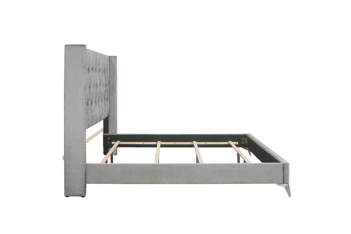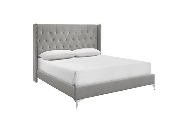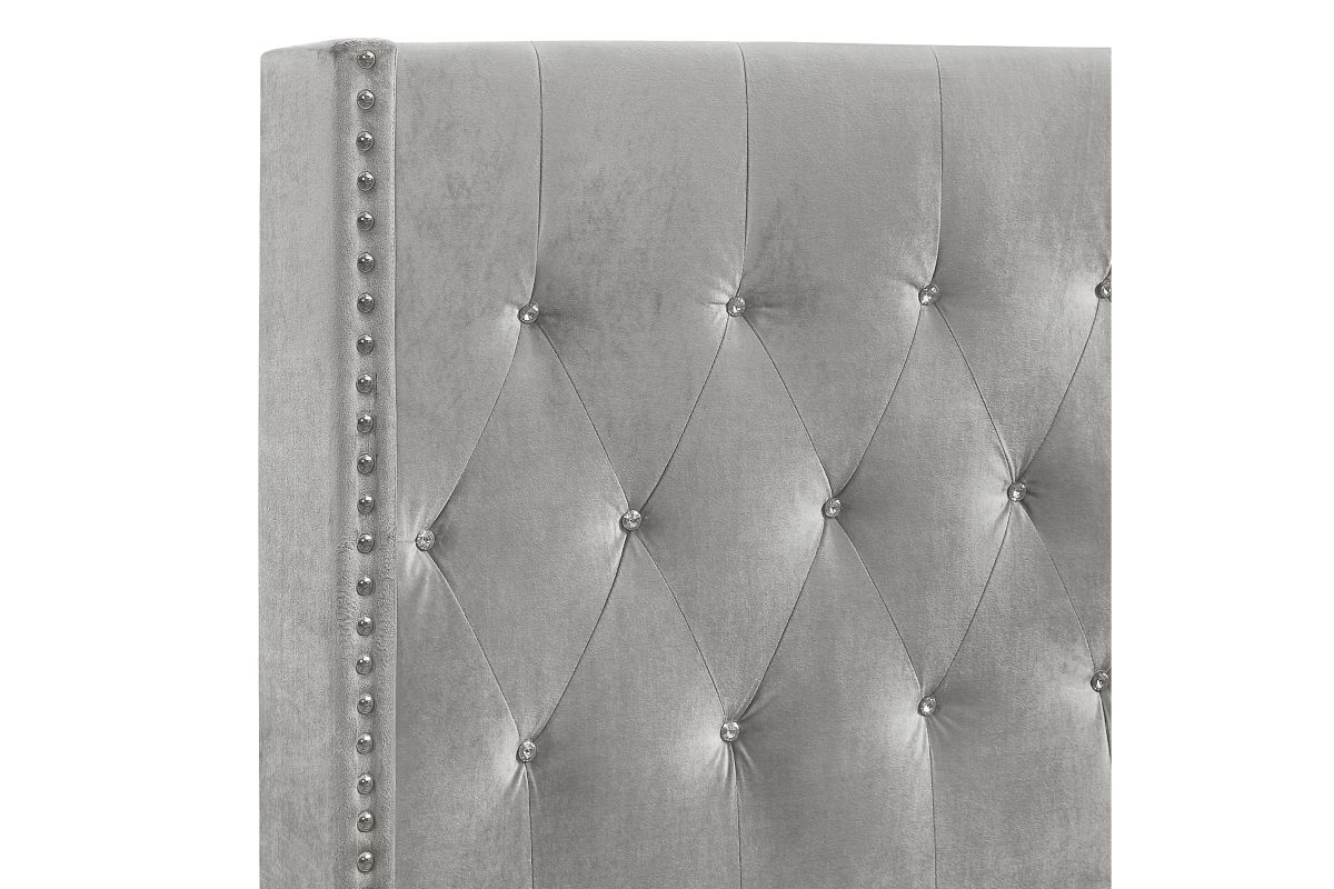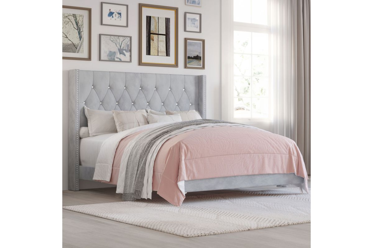 The Huxley Upholstered Bed in Gray combines contemporary glam with durable construction for a stylish and comfortable bedroom centerpiece. This set includes a headboard, footboard, two side rails, and a slat kit, all crafted from manufactured woods and eco-friendly decorative laminate for long-lasting use. The bed features clean lines and a crystal button-tufted headboard with silver studded trim, offering a touch of luxury and comfort. Its inviting gray finish provides a sleek, modern look that complements contemporary interiors, creating a sophisticated and calming atmosphere. The neutral tone pairs beautifully with the metallic accents and luxurious upholstered headboard, adding a touch of glamour and cohesion to the overall design. The 100% polyester velvet fabric exudes elegance with its soft feel and plush padding, ensuring maximum comfort. What's Included: (1) Headboard, (1) Footboard, (2) Side Rails, Slat Kit. Assembly required.