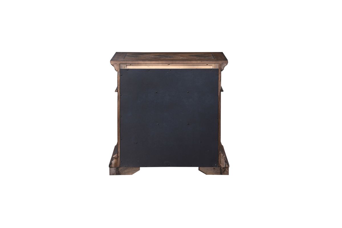 Discover the Mar Vista Nightstand, a testament to craftsmanship and timeless design. Constructed with solid Rubberwood and Oak veneers, this nightstand promises enduring strength and stability. Its rich walnut finish, achieved through meticulous distressing, wire brushing, and charcoal glazing, accentuates the wood’s inherent beauty. The nightstand’s traditional style is expressed through prominent crown moldings, carved bracket feet, and convex pilaster moldings, all complementing the distinctive herringbone wood inlays that define the Mar Vista Collection. Beyond its external elegance, the nightstand offers quality internal features, including drawers built with English dovetail joinery, full extension drawer glides, and polished drawer interiors. The three spacious drawers provide ample storage for bedside necessities, with a felt-lined top drawer to protect watches, glasses, and other sensitive items. Experience the blend of functionality and aesthetic appeal with the Mar Vista Nightstand. No assembly required.