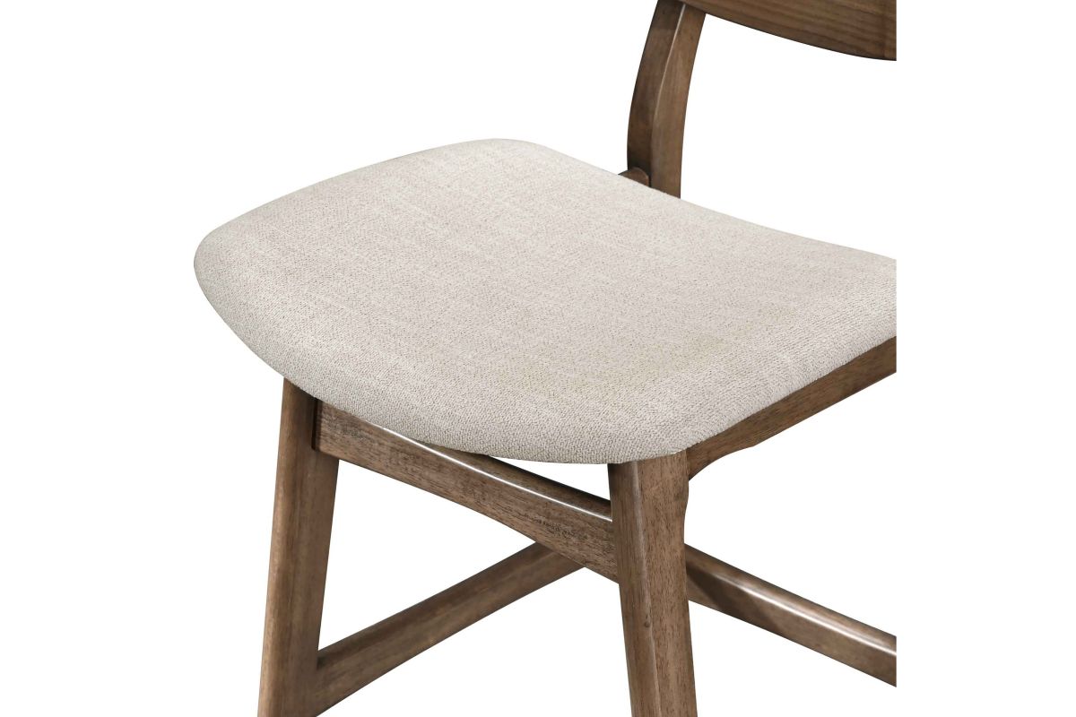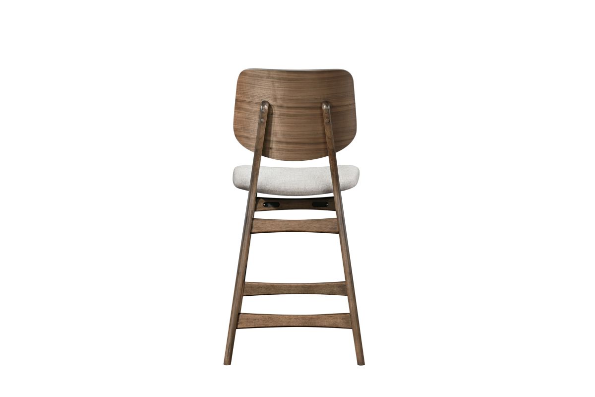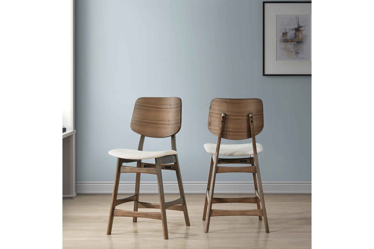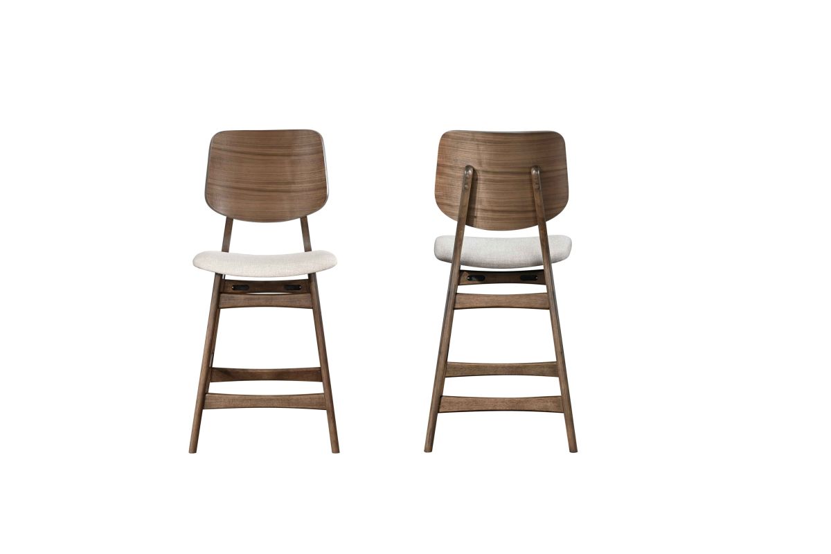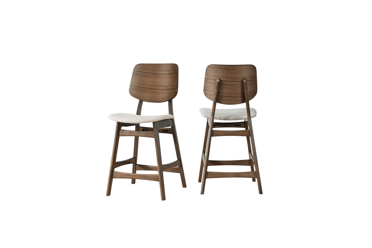The Oscar Mid-Century Modern Counter Height Dining Chairs (Set of Two) offer a perfect blend of style and practicality for your dining space. Crafted from solid Rubberwood and Walnut veneers, these counter height chairs are built to last, with reinforcing base stretchers providing added stability and durability. The clean, clear finish highlights the natural beauty and grain patterns of the Walnut, adding a touch of sophistication to your home. Emphasizing clean lines, organic curves, and functional design, the Oscar Dining Collection captures the essence of mid-century modern style. These counter height chairs not only enhance your decor but also ensure comfort with foam seat cushions wrapped in natural beige 100% polyester fabric. Ideal for any counter height dining table, these chairs balance form and function, creating an inviting and practical living space. The Oscar Mid-Century Modern Counter Height Dining Chairs are a stylish and durable addition to any contemporary home, offering both aesthetic appeal and comfort.