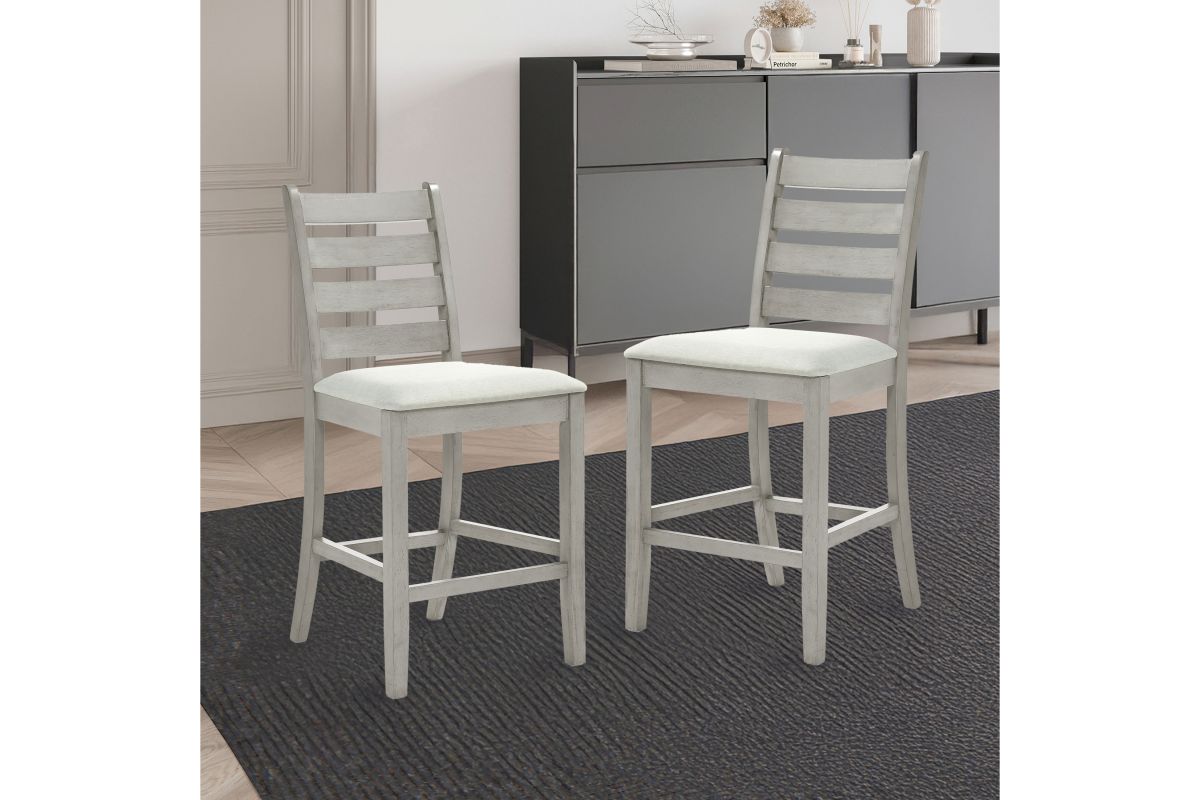 Introducing the Pascal Ladderback Counter Chairs in Driftwood Gray, a perfect blend of durability and style. Sold in sets of two, these counter-height chairs are crafted from solid Rubberwood and feature four base stretchers for enhanced stability, ensuring they withstand daily use with ease. The chairs boast a light, sophisticated finish achieved through a meticulous multi-step process, including rub-throughs and glazing that enhance the natural beauty of the wood. Designed for comfort, each chair includes high-density foam cushions covered in easy-care 100% polyester fabric, offering a comfortable seating experience. With subtly rounded edges, tapered legs, and a classic ladderback design, these chairs bring an upscale look to any space. Their versatile style seamlessly fits into transitional, farmhouse, and contemporary decor, making the Pascal Ladderback Counter Chairs a stylish and practical addition to your dining or kitchen area. Assembly required.
