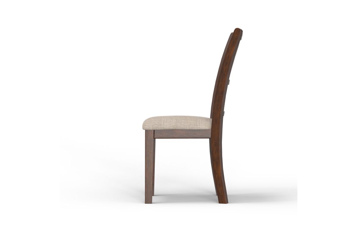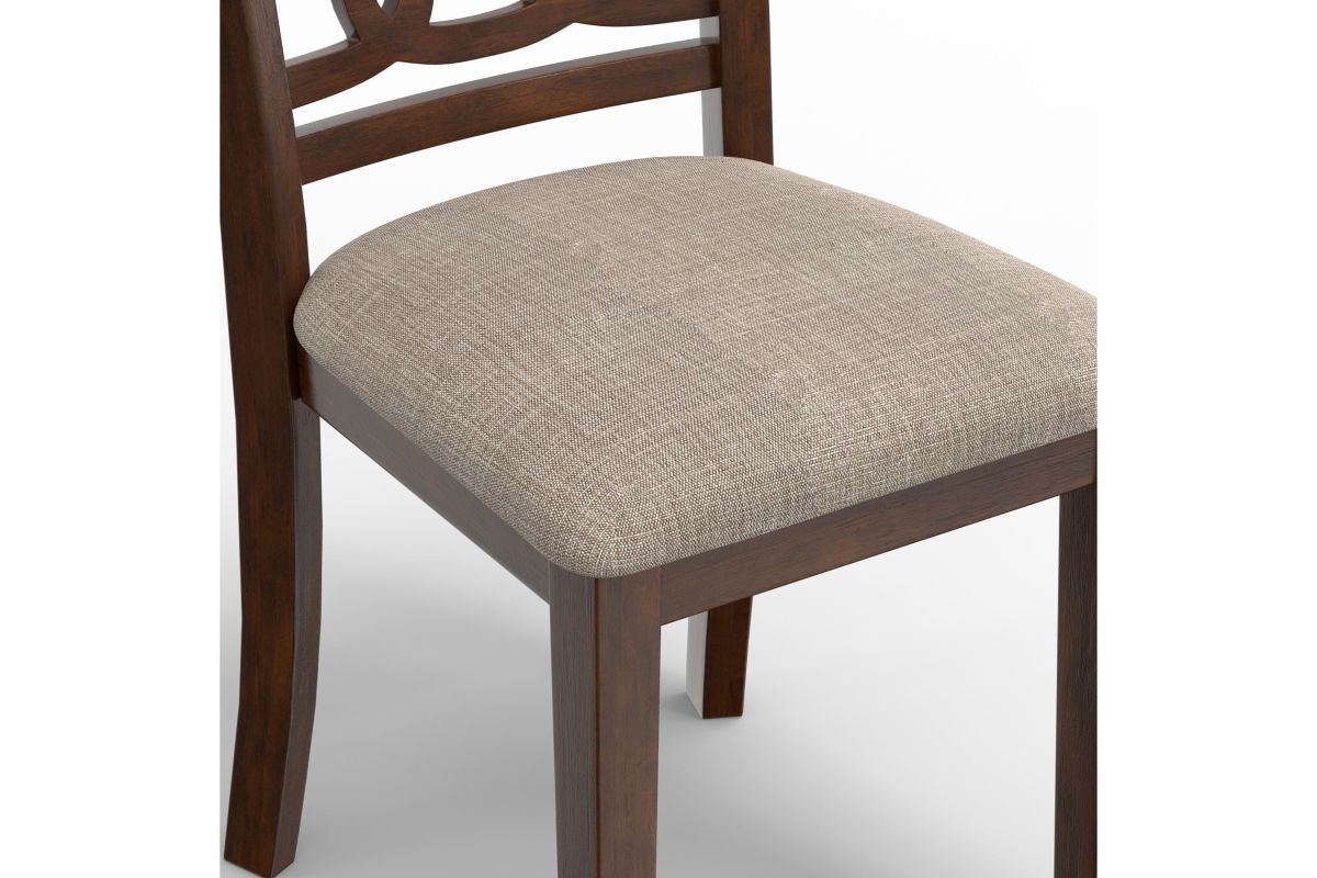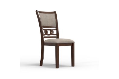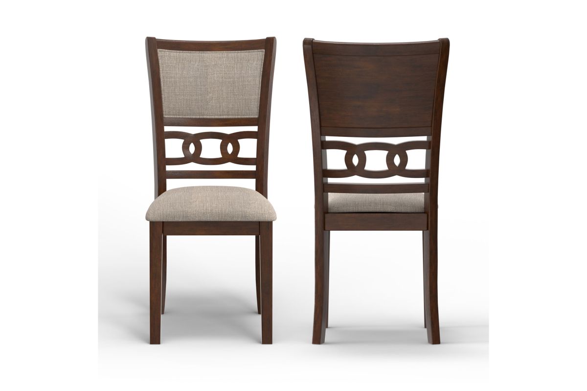 Enhance your dining space with this set of two New Classic Gia Wood Dining Chairs in a rich brown cherry finish. Crafted from solid Rubberwood and Mindi veneers, these chairs offer a perfect blend of durability and aesthetic appeal. The brown cherry finish, achieved through a multistep process and clear coat, highlights the exquisite wood grain. Designed for comfort and longevity, the chairs feature easy care 100% polyester upholstered cushions and backs supported by sturdy solid wood legs. The transitional style, characterized by interlocking chain chair back detail, tapered legs, and clean lines, seamlessly complements any dining room decor. Assembly is a breeze with all necessary hardware and clear instructions included. With a one-year warranty, these dining chairs are a practical and stylish addition to your home. Invest in quality and style with the Gia Wood Dining Chairs. Assembly required.