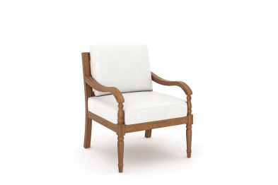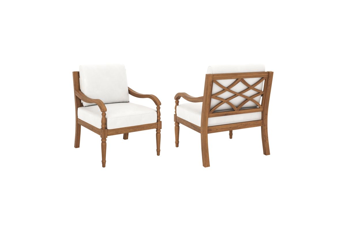 Relax in the Savannah Club Chairs, a set of two that allows for cozy conversations. Crafted with FSC Certified, Eco-Friendly Acacia Solid Wood, these chairs promise years of outdoor enjoyment. Their color fast, weather resistant fabric, made of solution dyed 100% Polyester, ensures resistance to fading, mildew, and moisture, keeping them looking fresh through the seasons. Sink into luxurious comfort of the high density, 16cm foam seat and back cushions, providing resilient and relaxing seating. Embracing a gracious, traditional style, with their light wood finish, turned legs, and curved armrests, complemented by white linen fabric, these club chairs exude an aura of southern hospitality, making them a charming addition to any outdoor space. Assembly required.