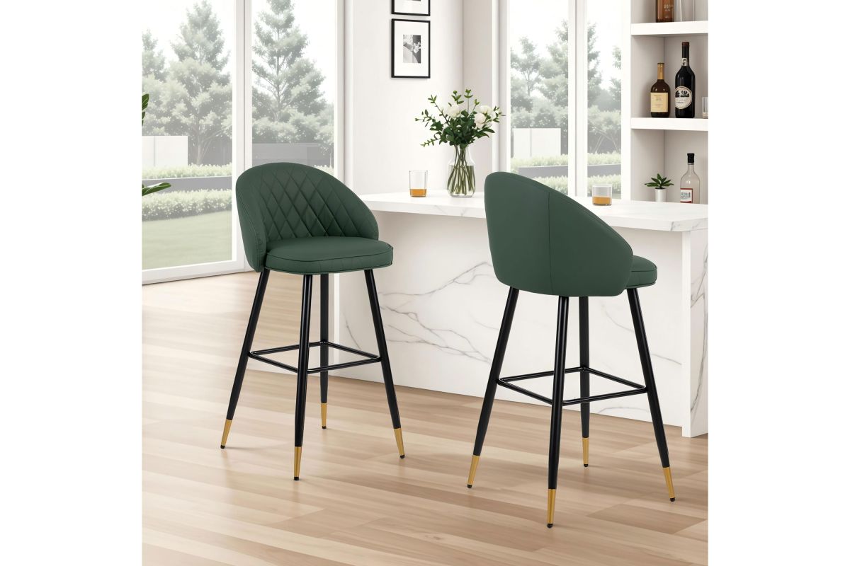 The Oliver Green Faux Leather Bar Chair set combines contemporary style with practical features to enhance any modern space. Each set includes two bar chairs with a sleek, arched back and low profile, offering a chic yet refined aesthetic. Crafted from eco-friendly vegan leather, the chairs deliver the luxurious look of leather without the maintenance, with intricate diamond tufting for added sophistication. The sturdy, tapered black iron legs provide excellent stability, resisting bending or breaking, and are accented with subtle gold detailing for a touch of elegance. Dual-purpose footrests ensure both added stability and a comfortable spot to rest your feet. A perfect blend of style and functionality, these bar chairs offer long-lasting comfort and timeless design—an excellent addition to any home or bar setting. Assembly required.