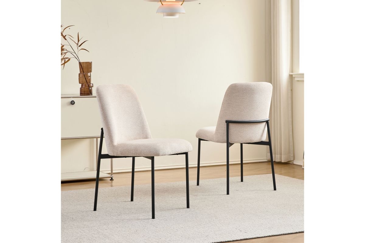 The Erik Side Chair set offers modern comfort and style, making it an ideal choice for any contemporary space. Each set includes two side chairs with fully upholstered, elegantly curved seats and backs, delivering both a sleek appearance and exceptional comfort. The natural beige woven fabric, made from 100% polyester, provides a soft and cozy feel while being easy to maintain, blending everyday practicality with a timeless look. The sturdy black iron tube legs ensure lasting stability and durability, resisting bending or breaking, while their sleek design contrasts beautifully with the fabric for a refined, modern aesthetic. With its combination of comfort, style, and durability, the Erik Side Chair is a smart addition to any home or dining setting. Assembly required.