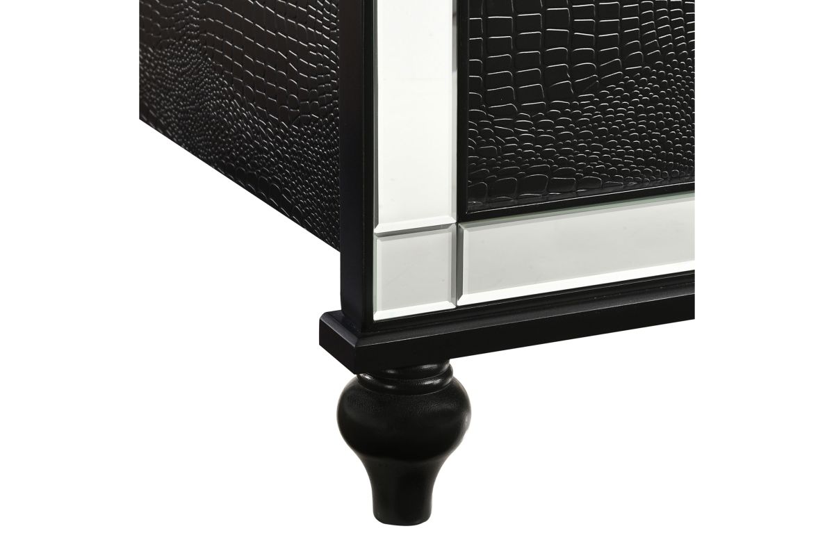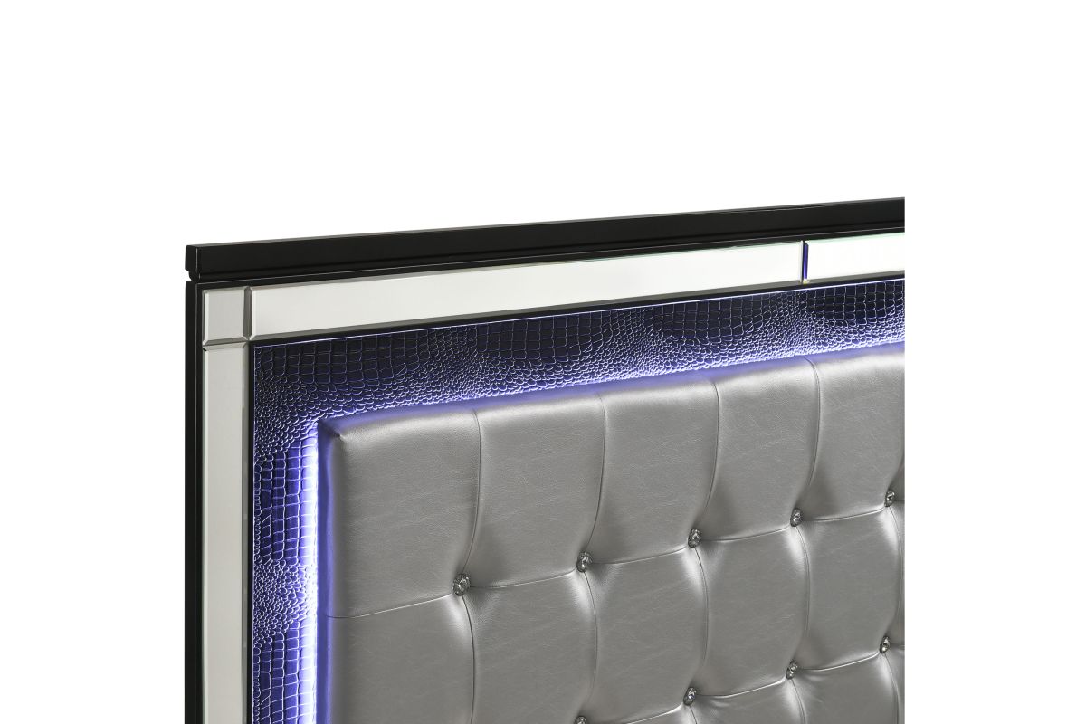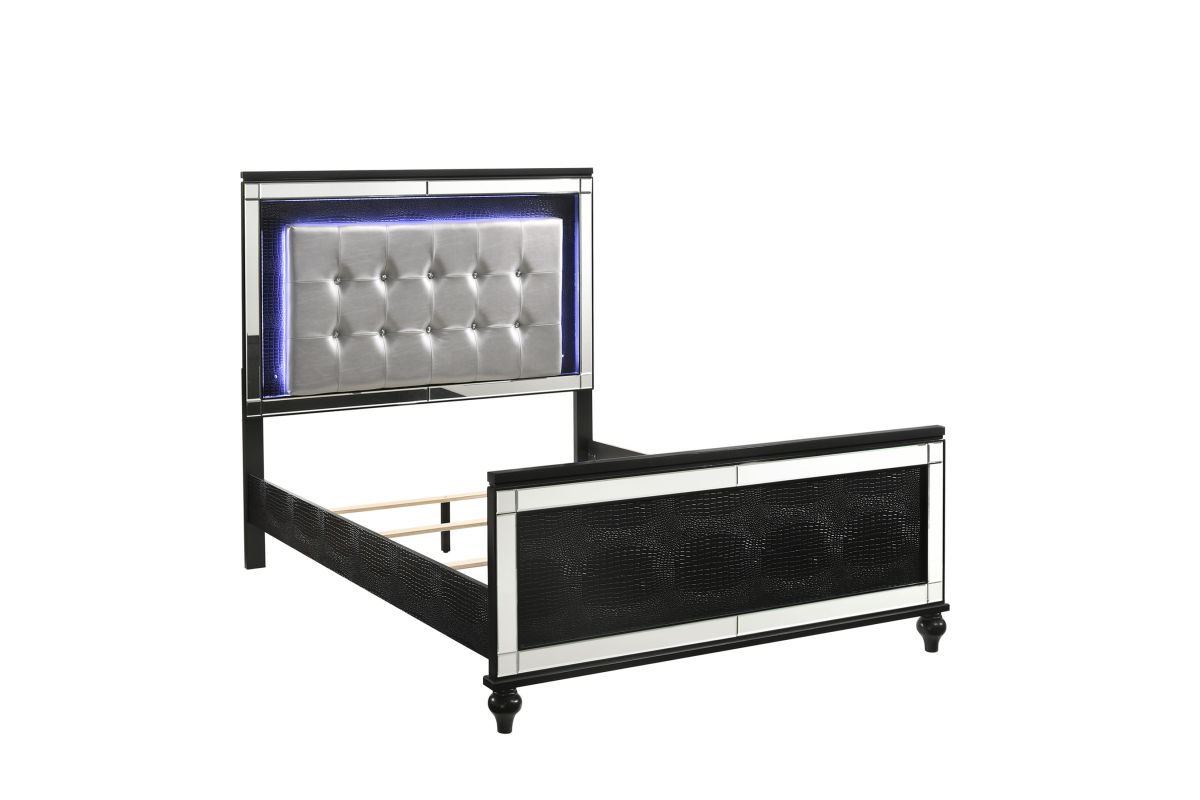 The Valentino Bed with Touch Lighting in Black is designed to transform your bedroom into a glamorous sanctuary. This opulent set is meticulously crafted from a blend of manufactured and solid woods, ensuring lasting quality and a distinctive appearance. The bed showcases a dazzling crystal button-tufted padded headboard, a gleaming black finish, mirrored trim, and exquisite alligator embossed inlays, all of which evoke an unparalleled Hollywood glam vibe. The sophisticated touch-controlled LED lighting offers soft, ambient illumination, creating an intimate and luxurious atmosphere. This magnificent bed set brings a touch of star quality to your contemporary bedroom suite, seamlessly combining extravagant style with exceptional craftsmanship. Assembly required. What's Included: (1) Headboard, (1) Footboard, (1) Slat Kit, (2) Side Rails