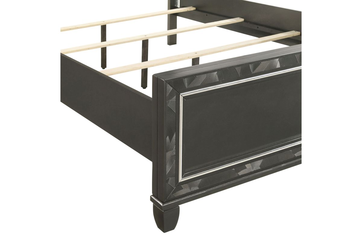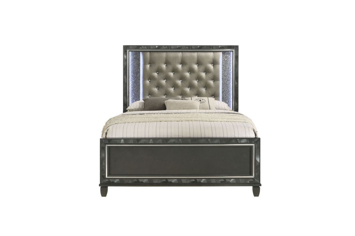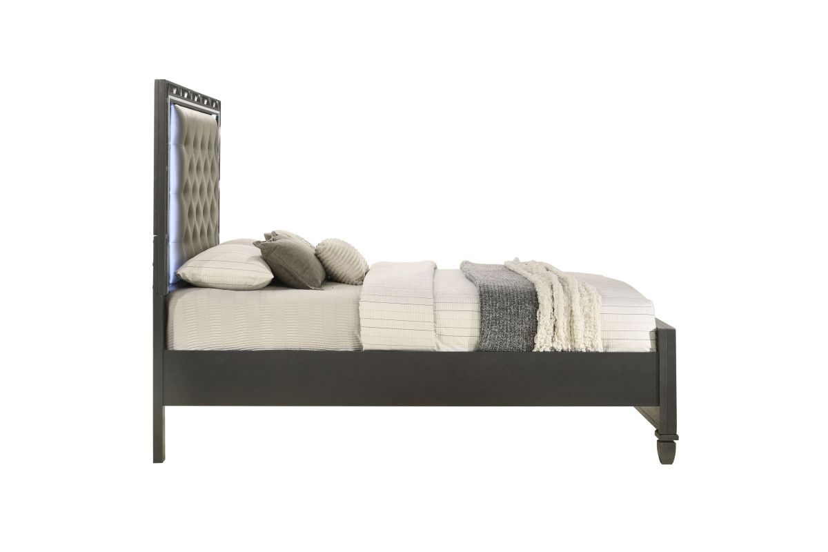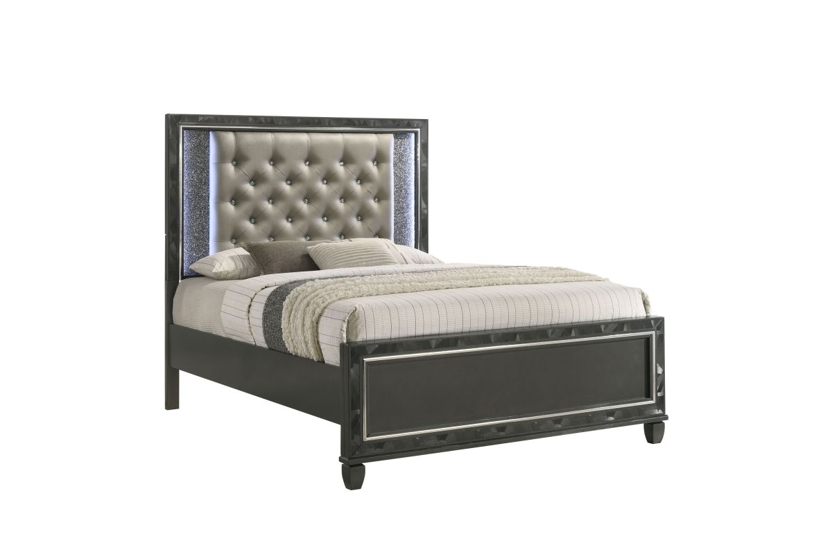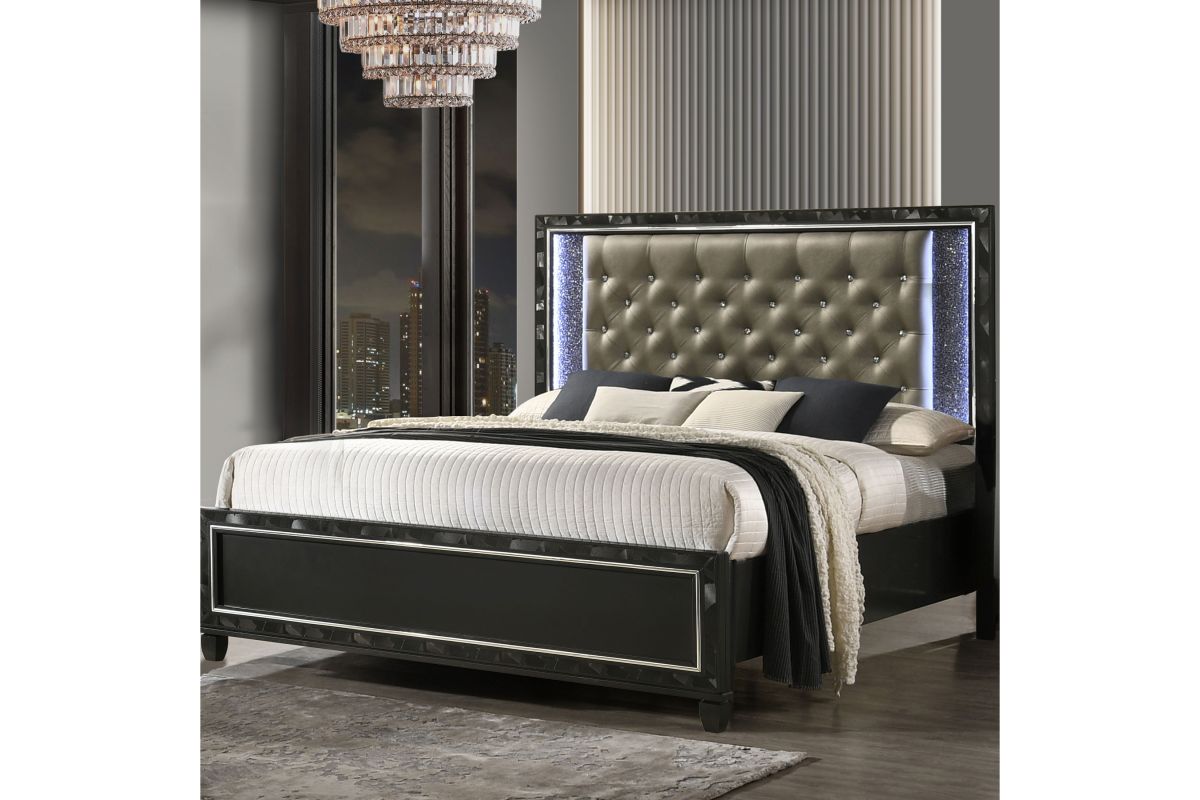 Discover the Radiance Queen Bed in Black Pearl, meticulously crafted for enduring stability and durability from a combination of Solid Rubberwood and manufactured woods. Its semi-gloss lacquer black pearl finish adds a silky, modern touch to this captivating collection. Glossy black textured inlays, mylar trim, and a crushed crystal decorative laminate frame the plushly upholstered, crystal button-tufted headboard, exuding opulent appeal. Designed with functionality in mind, LED lighting accents your space, casting a sparkling glow against the glamorous padded headboard. Transform your bedroom into a haven of luxury and style with the Radiance Queen Bed. Assembly required. Includes: (1) Queen Headboard, (1) Queen Footboard, Beds Slats and (2) Side Rails