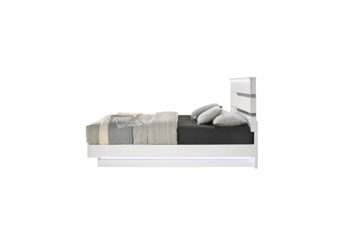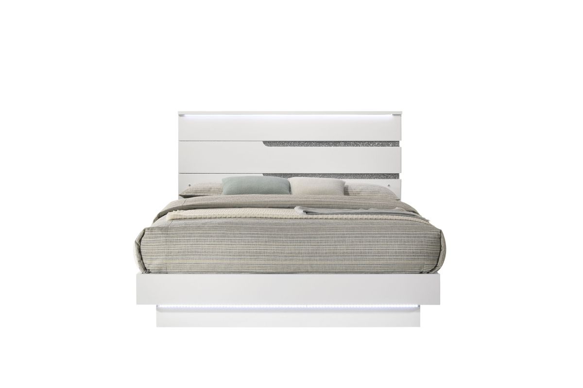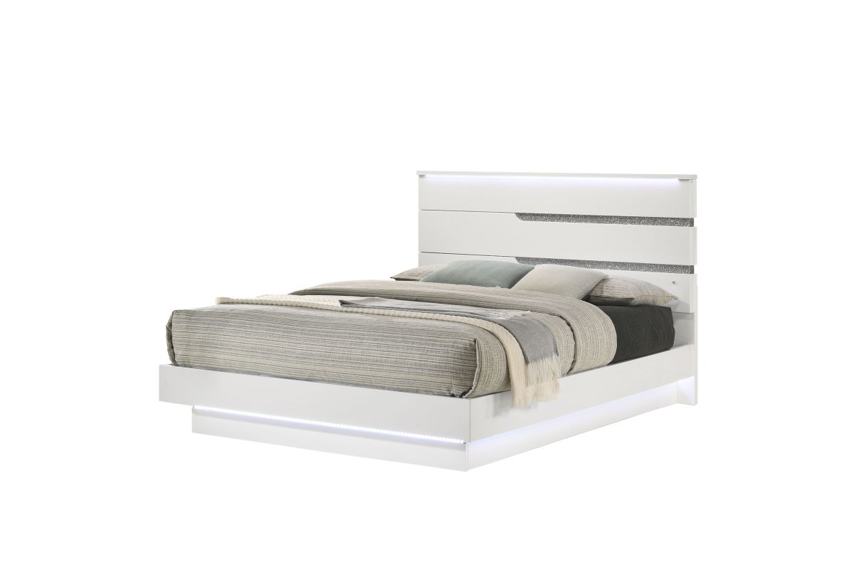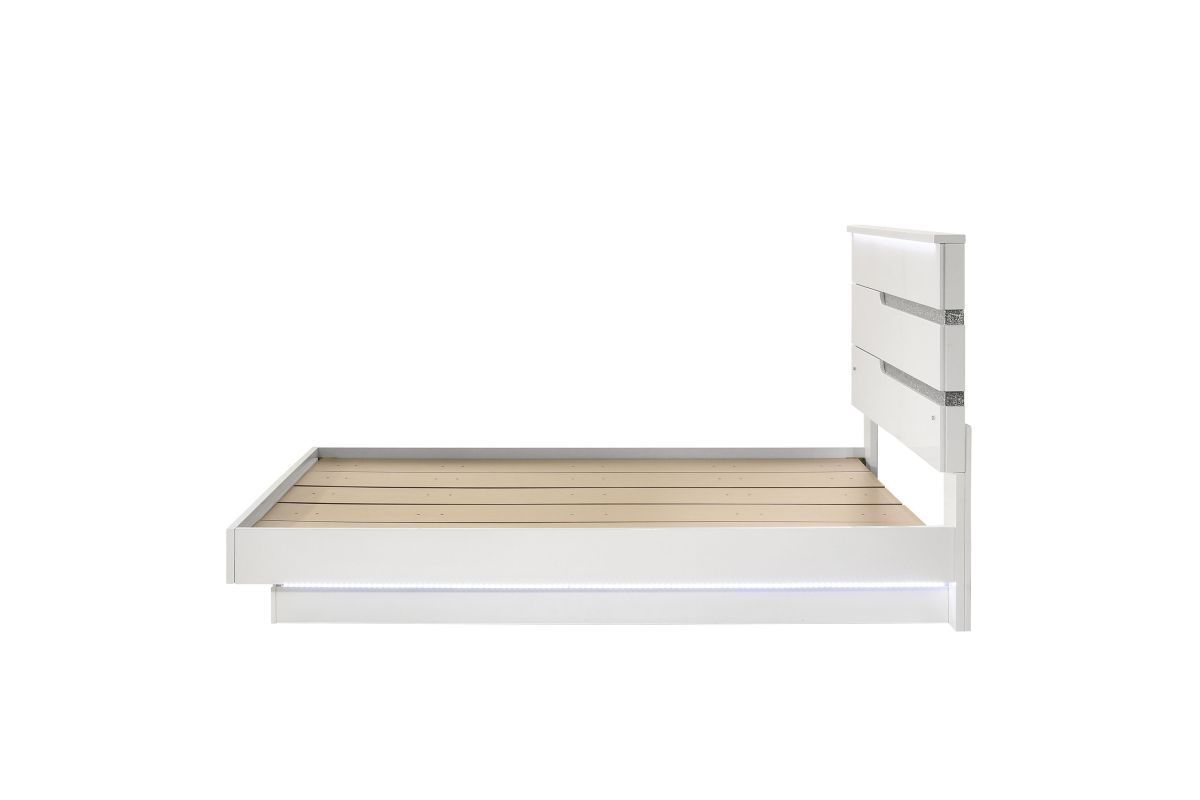 The Paradox Bed in White redefines contemporary elegance with its gleaming white gloss laminate finish that offers both a sleek look and practical benefits such as scratch and water resistance. This bed includes a headboard, footboard, side rails, and a bed slat kit, ensuring a complete and cohesive design. Built with a combination of solid and manufactured woods, it promises quality construction and long-lasting durability. The platform style bed eliminates the need for a box spring, providing a stable base for your mattress. Adding a touch of glitz and glam, the LED lighting on the platform and headboard creates an ambient glow that highlights the modern white finish and the glittering silver mylar inlays. This bed is not just a piece of furniture but a statement of luxury and sophistication for your bedroom. Assembly required. Includes: (1) Headboard, (1) Footboard, (2) Side Rails, Bed Slat Kit