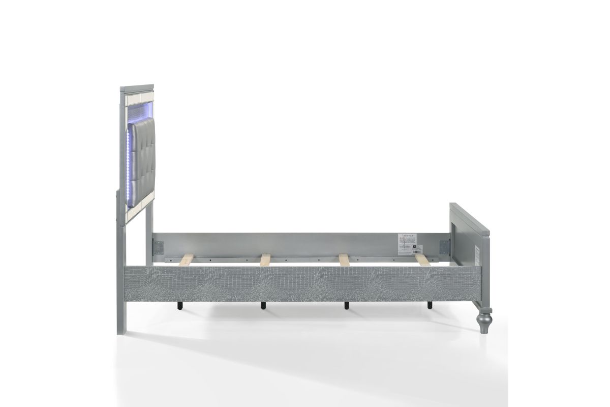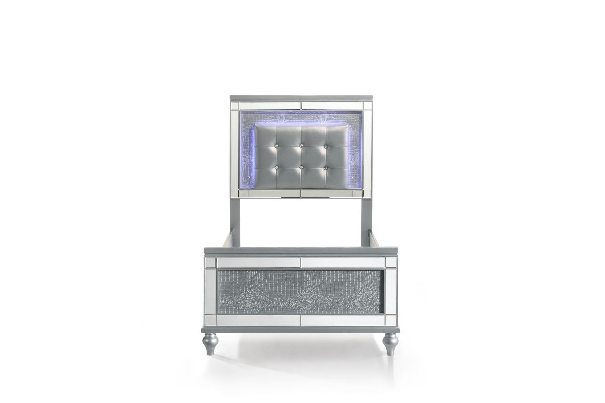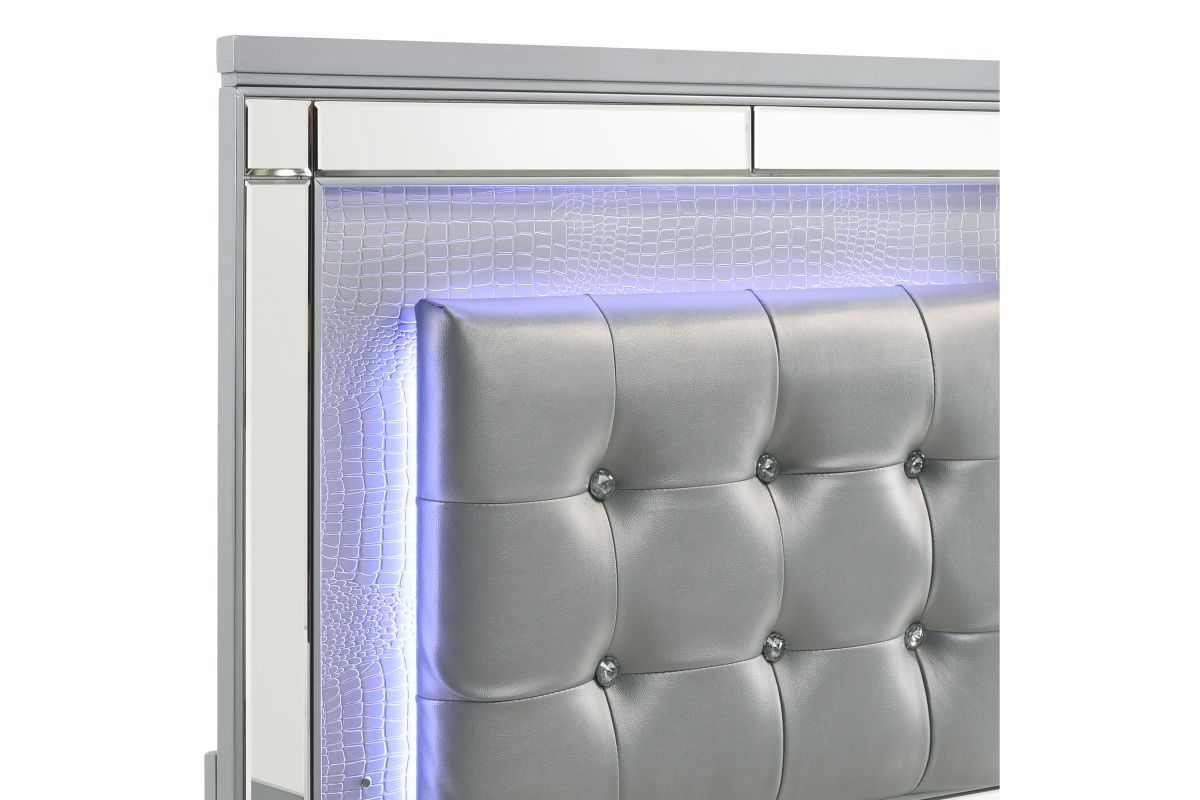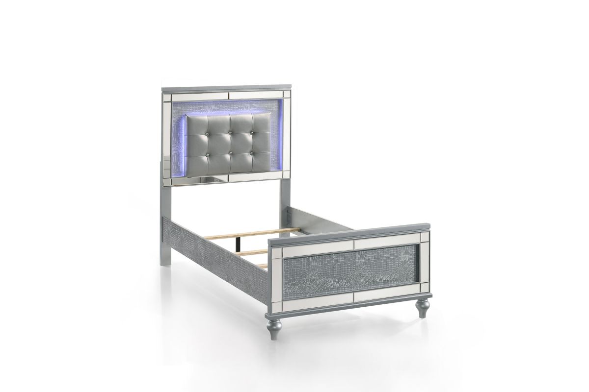 The Valentino Bed with Touch Lighting in Silver is designed to transform your bedroom into a glamorous sanctuary. This opulent set is meticulously crafted from a blend of manufactured and solid woods, ensuring lasting quality and a distinctive appearance. The bed showcases a dazzling crystal button-tufted padded headboard, a gleaming Silver finish, mirrored trim, and exquisite alligator embossed inlays, all of which evoke an unparalleled Hollywood glam vibe. The sophisticated touch-controlled LED lighting offers soft, ambient illumination, creating an intimate and luxurious atmosphere. This magnificent bed set brings a touch of star quality to your contemporary bedroom suite, seamlessly combining extravagant style with exceptional craftsmanship. Assembly required. What's Included: (1) Headboard, (1) Footboard, (1) Slat Kit, (2) Side Rails