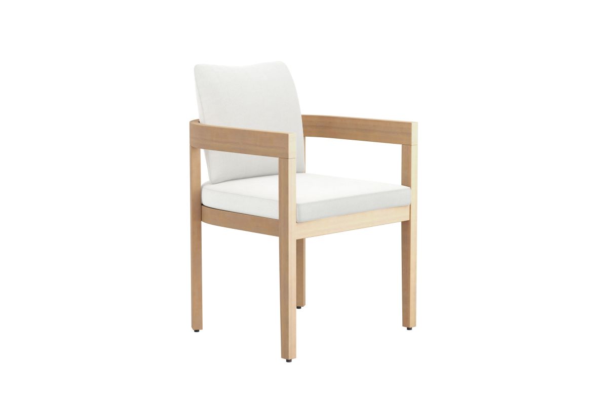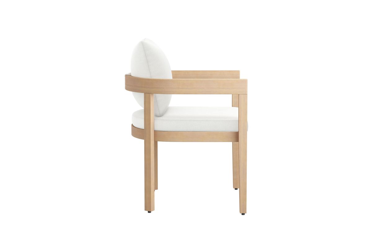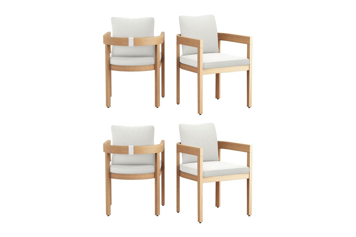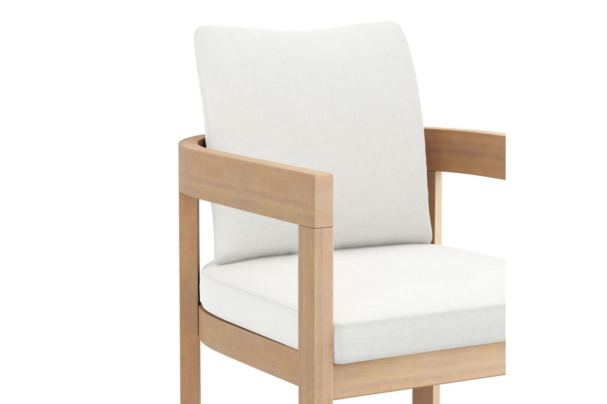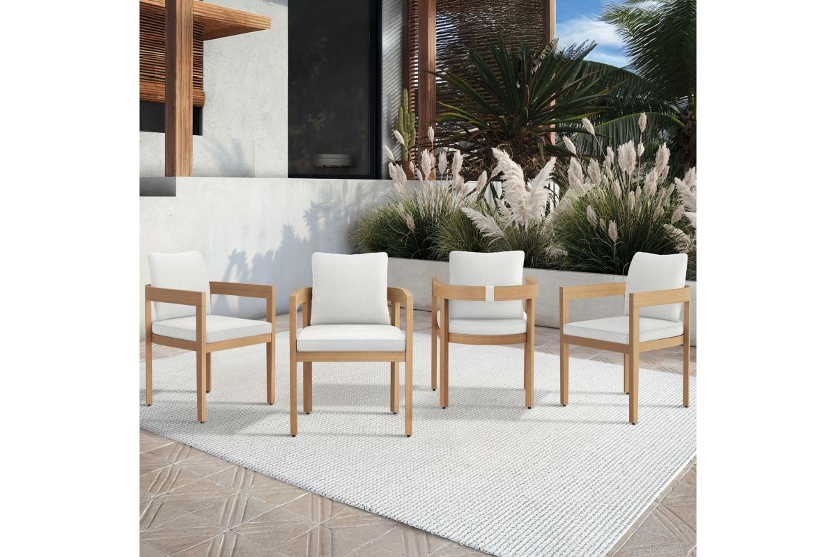 The Wesley Patio Side Chairs with White Cushions (Set of 4) combine durability, comfort, and modern elegance to elevate any outdoor dining space. Expertly crafted from FSC-Certified Acacia solid wood, these chairs offer exceptional strength and natural resistance to the elements, ensuring long-lasting beauty and performance. The expertly applied light, clear multistep finish enhances the natural wood grain’s rich texture and color while providing a protective layer for added durability in outdoor environments. Designed for comfort, each chair features high-density 6cm foam seat and back cushions wrapped in premium Sundura™ fabric—a solution-dyed 100% polyester that resists fading, mildew, and moisture, keeping the cushions vibrant and fresh season after season. The chairs' minimalist and airy design features sleek, clean lines and gently rounded shapes, blending modern sophistication with organic charm. Each piece is truly unique, showcasing natural wood grain variations with distinct patterns and textures that deliver timeless beauty and authentic character—ensuring no two chairs are exactly alike. Assembly required.