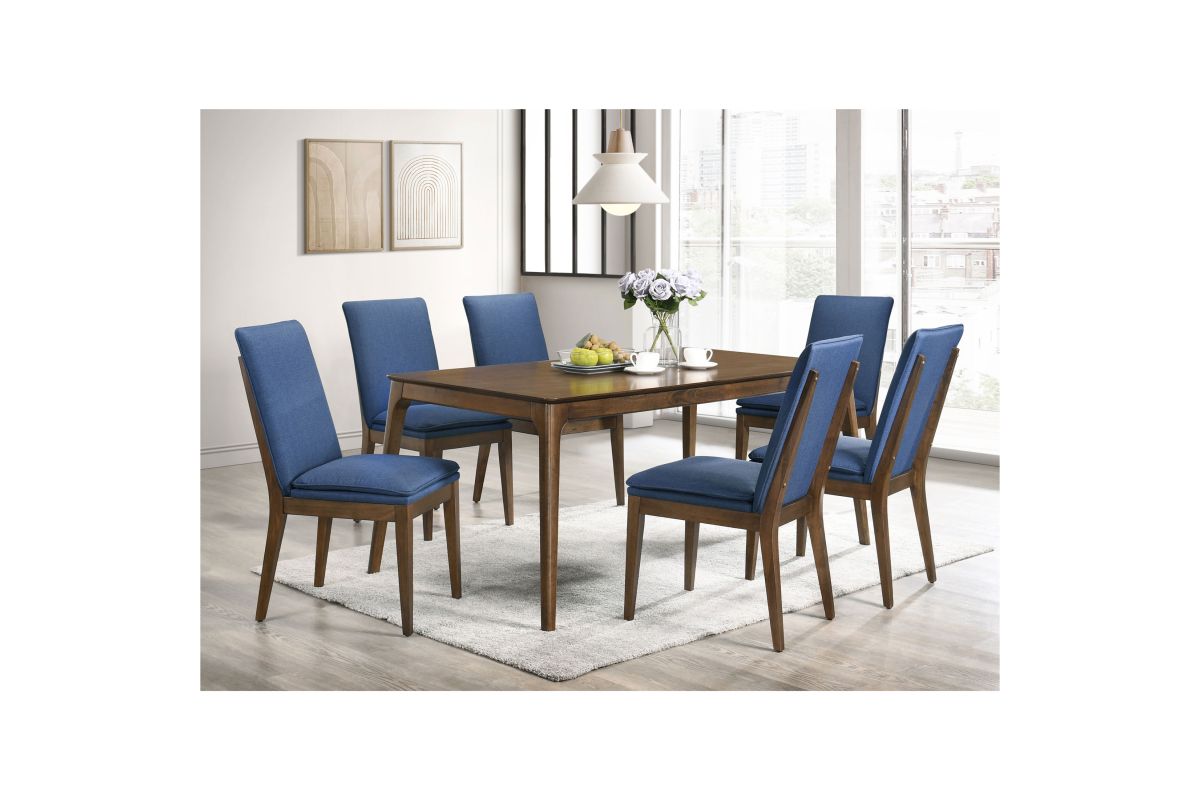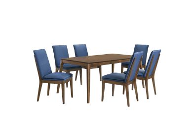 The Maggie 7 Piece Wood Dining Set masterfully blends contemporary design with lasting quality, offering a stylish and practical solution for your dining space. Crafted from a mix of solid Rubberwood, manufactured wood, and genuine Oak wood veneers, this set is as durable as it is beautiful. The rich walnut brown finish, applied through an intricate multi-step process, enhances the natural grain of the wood, giving each piece a distinctive character. The sleek 66" rectangular table provides ample room for six, making it perfect for hosting everything from casual family dinners to festive gatherings. The set’s six Parsons-style chairs, with their plush blue polyester upholstery, deliver exceptional comfort and a modern touch. This dining set’s clean lines and sophisticated design make it a versatile centerpiece that elevates any dining room—an ideal choice for those who appreciate both form and function. Assembly required. What's Included: (1) Dining Table, (6) Dining Chairs