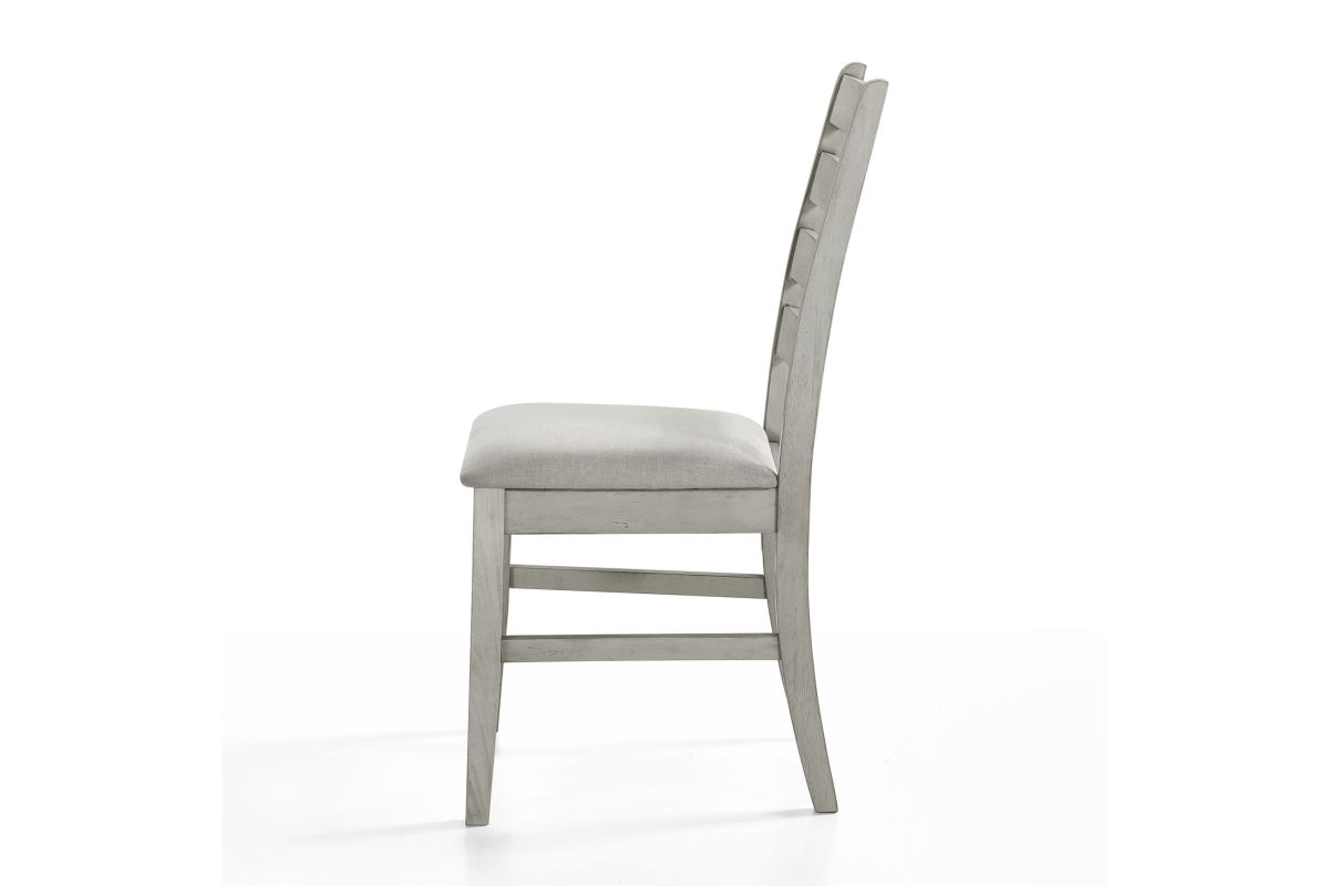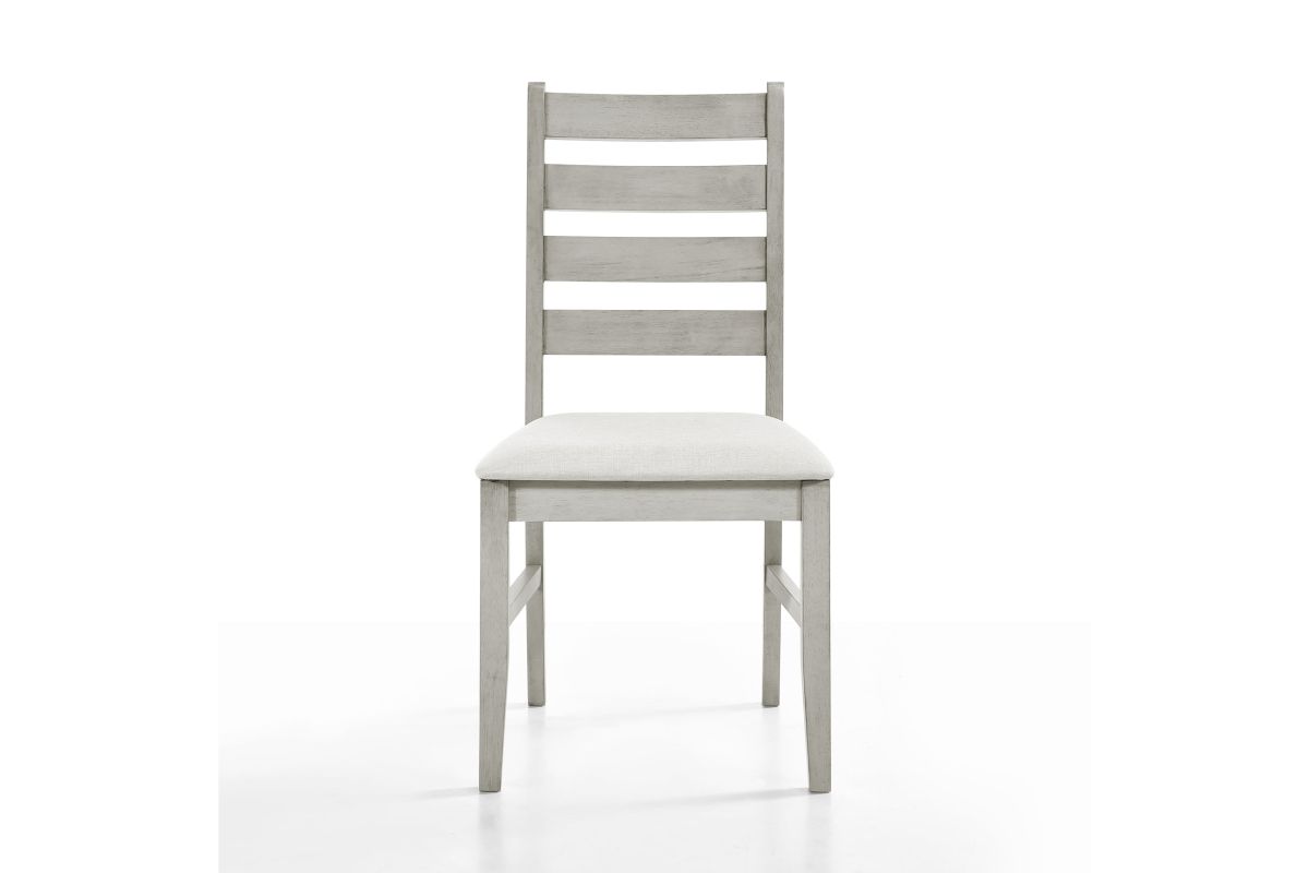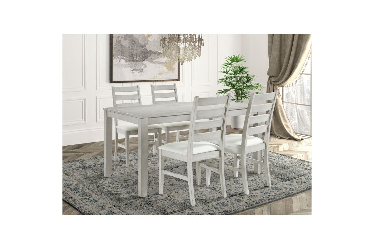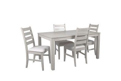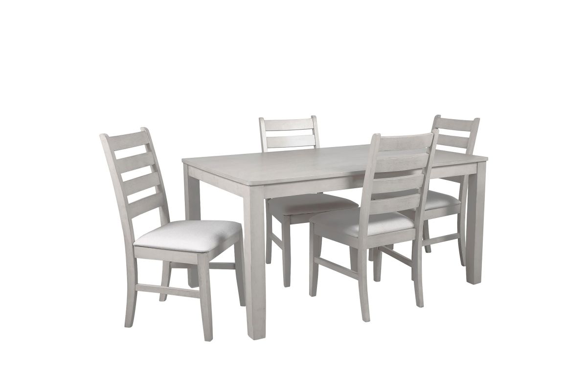 Experience the Pascal 5 Piece Dining Room Set in Driftwood Gray, a perfect blend of style and functionality. This set includes a 59-inch long rectangular wood dining table and four matching chairs, all crafted from a combination of solid Rubberwood and manufactured woods for exceptional durability. The solid wood chairs are reinforced with side base stretchers for added stability, ensuring they stand the test of time. The set’s light, sophisticated finish is achieved through a meticulous multi-step process that enhances the natural beauty of the wood with rub-throughs and glazing. Each chair is designed with comfort in mind, featuring high-density foam cushions covered in 100% polyester fabric that is both soft and easy to maintain. The roomy dining table offers ample space for six, making it ideal for family dinners, entertaining guests, or enjoying game nights. The Pascal set’s design is versatile, with subtly rounded edges, tapered legs, and elegant ladderback chairs that fit seamlessly into transitional, farmhouse, and contemporary decor styles. This dining set not only provides a comfortable seating experience but also adds a touch of timeless elegance to your dining room. Assembly required. What's Included: (1) Dining Table, (4) Dining Chairs