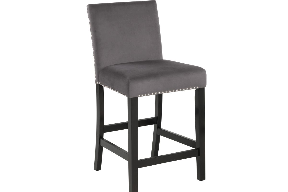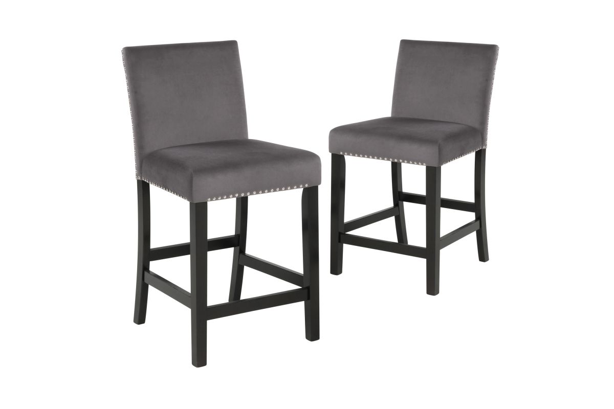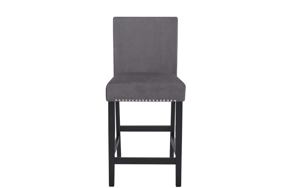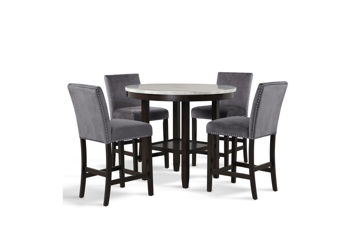 The Celeste 5-Piece Counter Dining Set is an exquisite combination of modern sophistication and enduring craftsmanship. This set includes a chic 42-inch counter table with an espresso base and a faux marble top, accompanied by four stunning gray velvet chairs. Crafted from solid Rubberwood and high-quality manufactured wood components, the dining set is designed for longevity, ensuring a lasting addition to your dining space. The glossy finish on the tabletop provides both heat and water resistance, ensuring easy cleaning and protection from wear. The white and gray veined faux marble top, complemented by deep espresso legs, creates a contemporary and glamorous ambiance. Luxurious seating awaits with the soft and durable 100% polyester velvet fabric covering sumptuous memory foam cushions, offering both comfort and easy maintenance. The stability of the counter chairs is enhanced by four base stretchers, which double as convenient footrests. Tailored for elegance, the rich and luxurious colors of the velvet chairs are enhanced by silver nailhead trim, providing a sparkling final touch to this impeccable dining set. Elevate your dining experience with the Celeste counter dining set—a fusion of contemporary glamour and enduring quality. Assembly required. What's Included: (1) Dining Table, (4) Dining Chairs, Hardware and Assembly Instructions