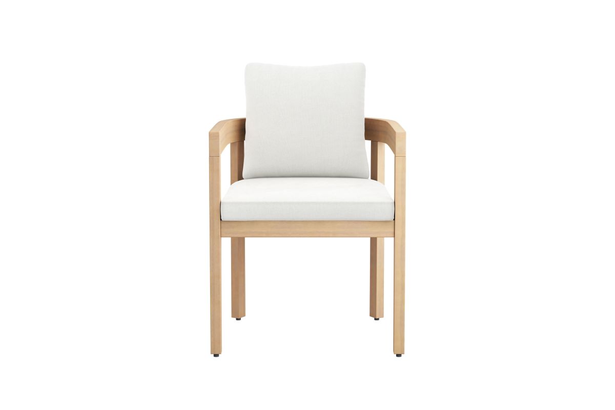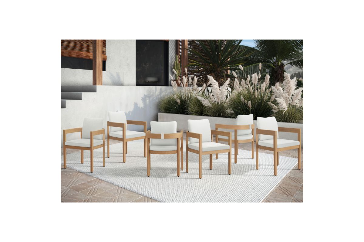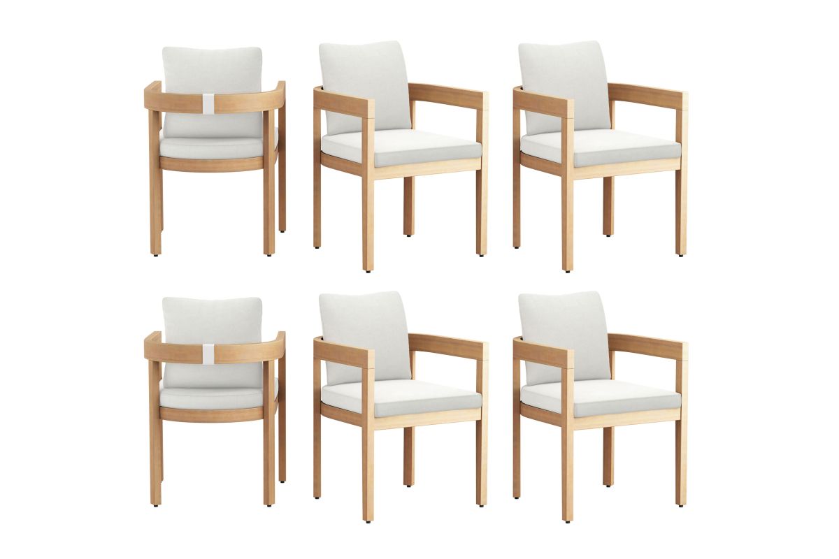 The Wesley Patio Side Chairs with White Cushions (Set of 6) combine durability, comfort, and modern elegance to elevate any outdoor dining space. Expertly crafted from FSC-Certified Acacia solid wood, these chairs offer exceptional strength and natural resistance to the elements, ensuring long-lasting beauty and performance. The expertly applied light, clear multistep finish enhances the natural wood grain’s rich texture and color while providing a protective layer for added durability in outdoor environments. Designed for comfort, each chair features high-density 6cm foam seat and back cushions wrapped in premium Sundura™ fabric—a solution-dyed 100% polyester that resists fading, mildew, and moisture, keeping the cushions vibrant and fresh season after season. The chairs' minimalist and airy design features sleek, clean lines and gently rounded shapes, blending modern sophistication with organic charm. Each piece is truly unique, showcasing natural wood grain variations with distinct patterns and textures that deliver timeless beauty and authentic character—ensuring no two chairs are exactly alike. Assembly required. What's Included: (6) Patio Dining Side Chairs